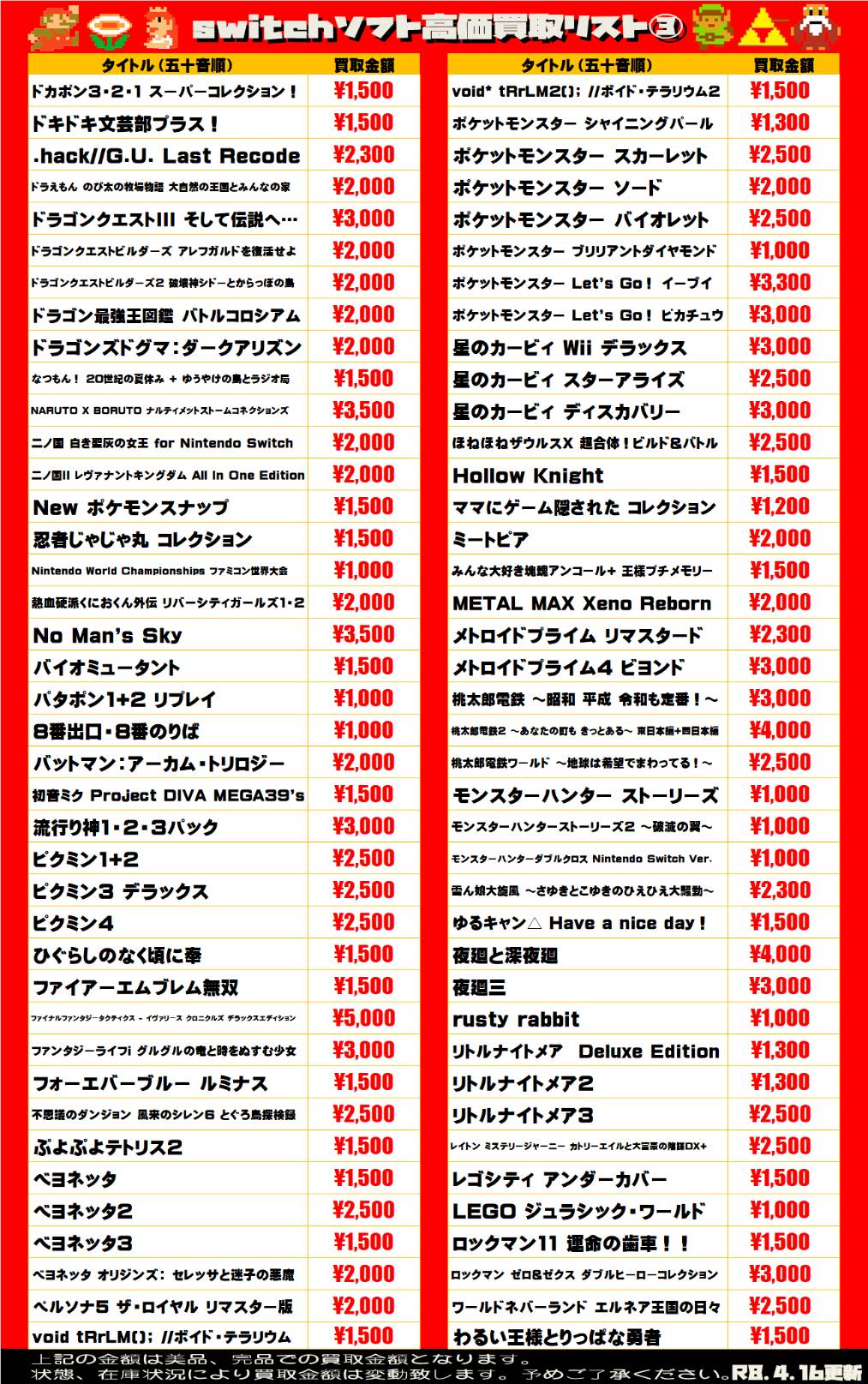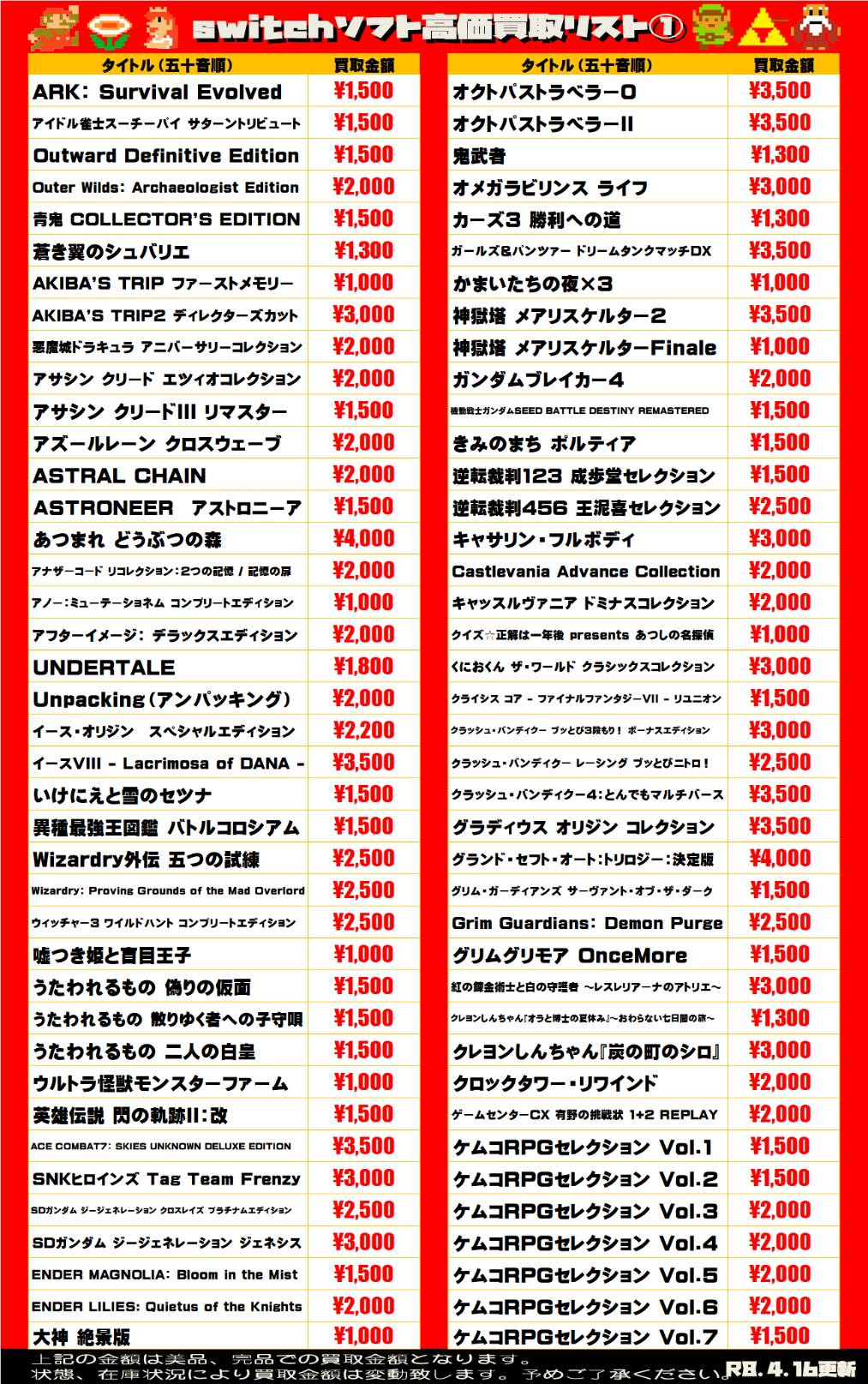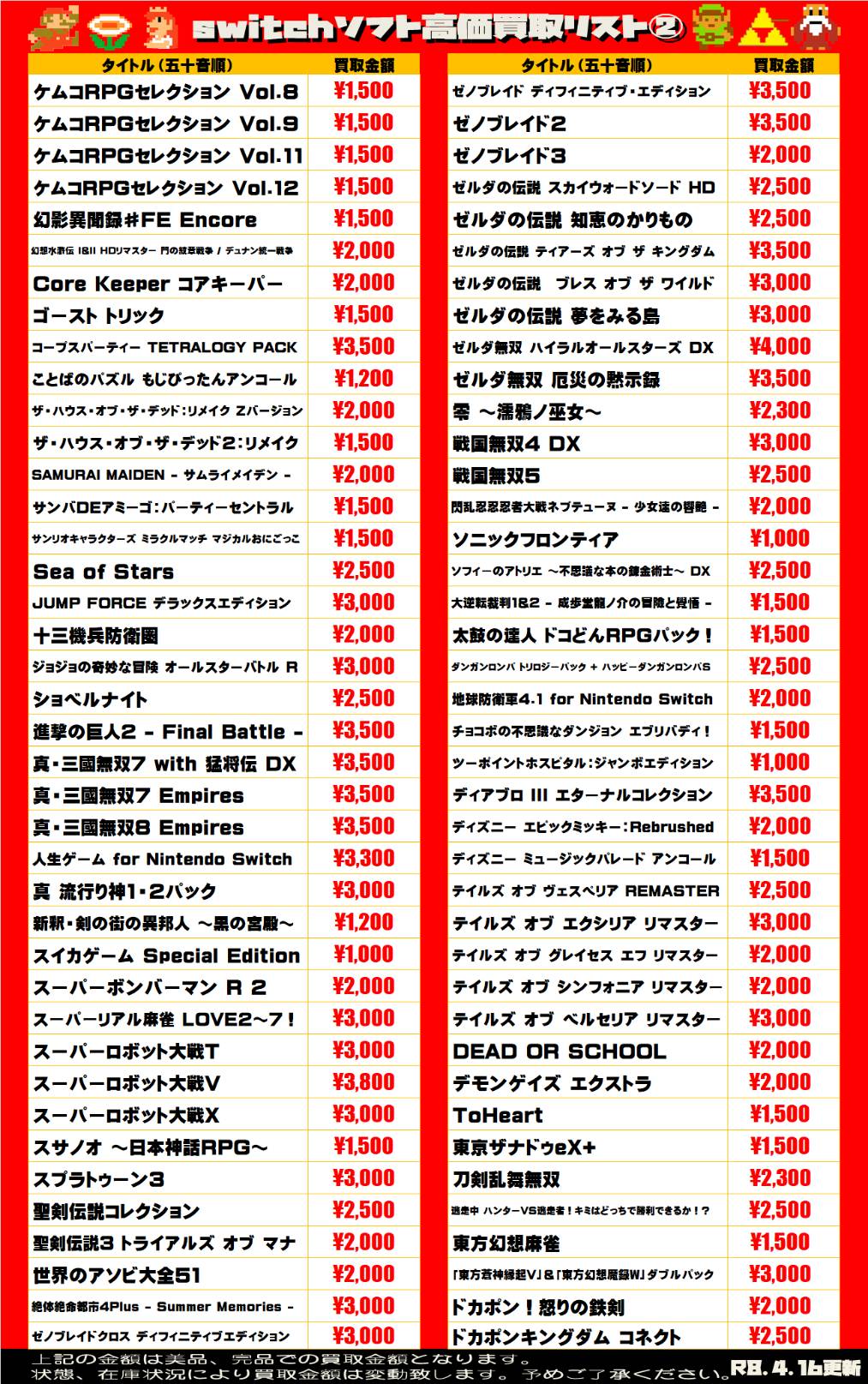 2026.04.16 買取情報 takalab_3 【Switch系ソフト】WEBチラシ更新しました!【WEBチラシ】 【Switch系ソフト】WEBチラシ更新しました!【WEBチラシ】 ※2026/4/16現在の価格となります。 在庫状況・状態によってお値段が変動いたします。予めご了承ください。 **************** こちら↓もぜひチェックしてみてくださいね♪(*´▽`*) ・最新のイベント情報はこちら ・最新の買取情報はこちら コメントを残す コメントをキャンセルメールアドレスが公開されることはありません。 ※ が付いている欄は必須項目ですコメント ※ 名前 ※ メール ※ サイト 新しいコメントをメールで通知 新しい投稿をメールで受け取る Δ