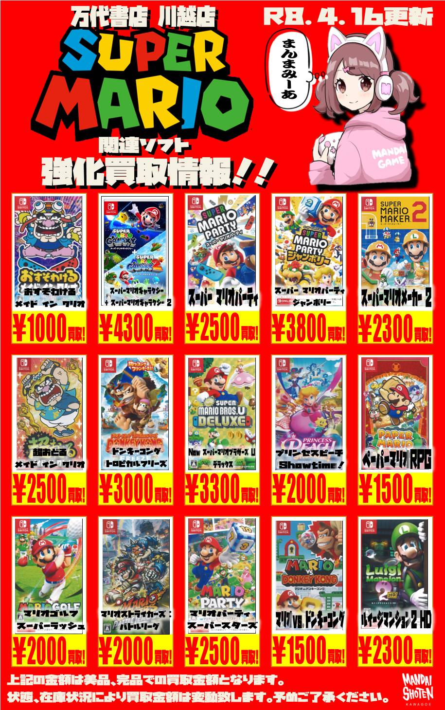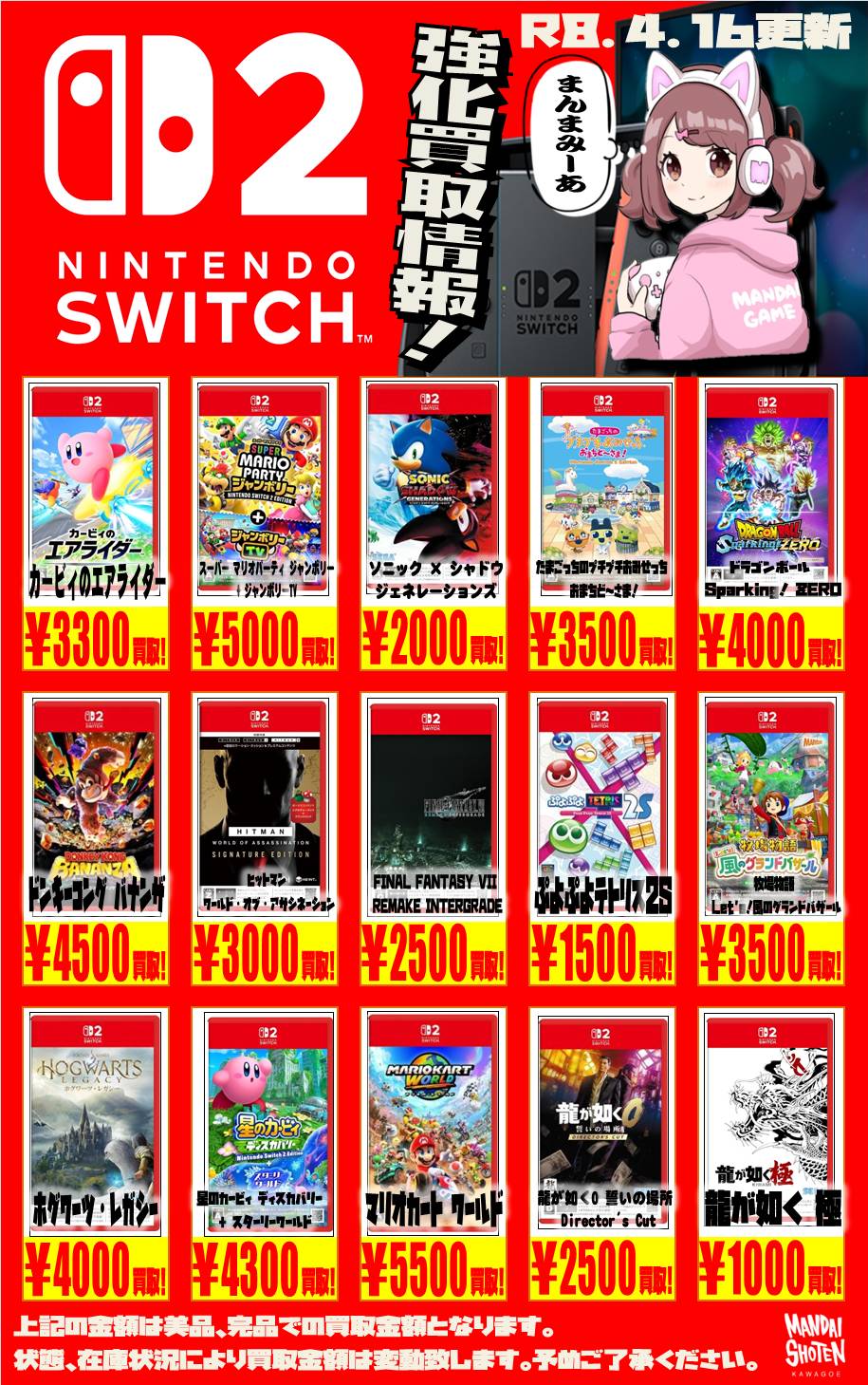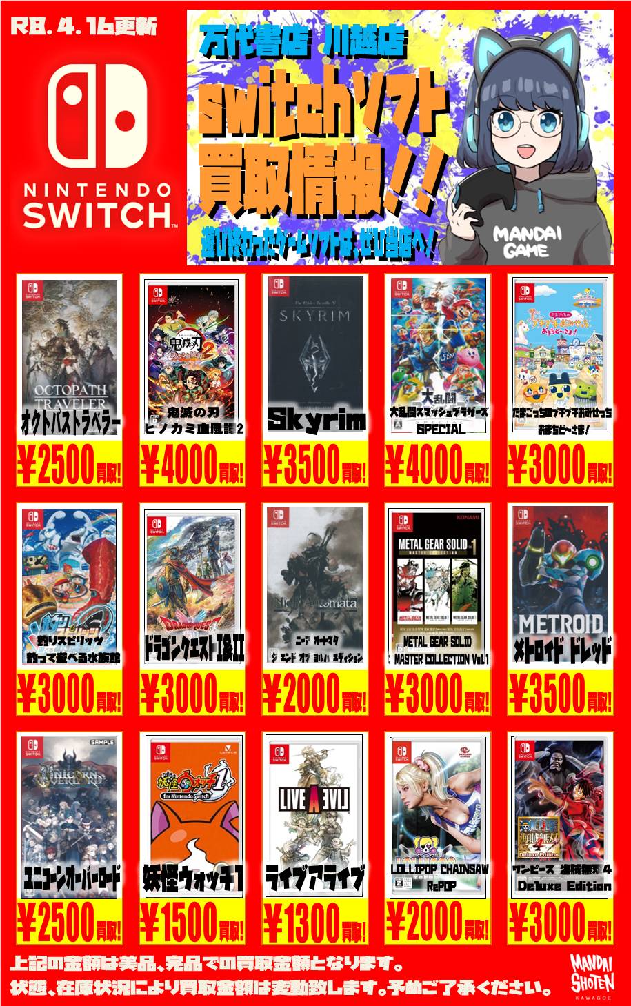 2026.04.16 買取情報 takalab_3 【Switch系ソフト】WEBチラシ更新しました!【WEBチラシ】 【Switch系ソフト】WEBチラシ更新しました!【WEBチラシ】 ※2026/4/16現在の価格となります。 在庫状況・状態によってお値段が変動いたします。予めご了承ください。 **************** こちら↓もぜひチェックしてみてくださいね♪(*´▽`*) ・最新のイベント情報はこちら ・最新の買取情報はこちら コメントを残す コメントをキャンセルメールアドレスが公開されることはありません。 ※ が付いている欄は必須項目ですコメント ※ 名前 ※ メール ※ サイト 新しいコメントをメールで通知 新しい投稿をメールで受け取る Δ