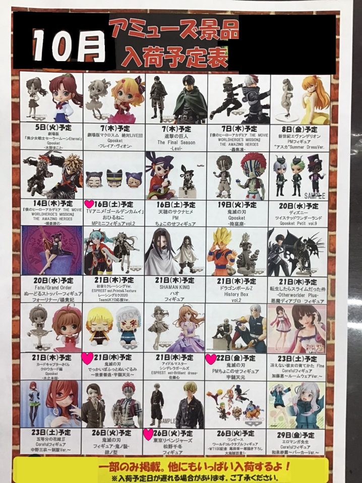 アミューズメントコーナーより‼️ 10月の入荷予定表です◎✨ 今月もたくさんの景品が入荷致しますのでUFOキャッチャーなら万代書店川越店にお任せください♬ 皆様のご来店お待ちして…