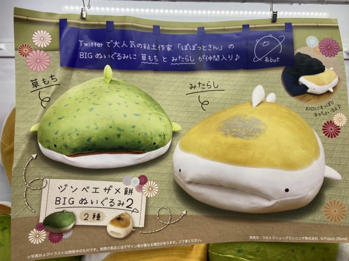 アミューズメントコーナーより新景品入荷の御案内です!!\(*^ω^*)/ ①ジンベエザメ餅 BIGぬいぐるみ2 全2種類 Twitterで大人気の粘土作家「ぽぽっとさん」のBIGぬいぐるみに草もちとみたらしが仲間入りしま…