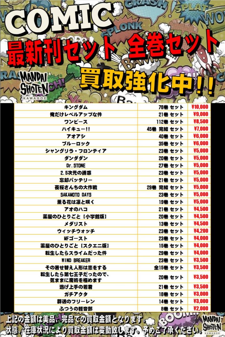 ◇コミックコーナーよりお知らせ◇ お待たせしました、コミックWEBチラシ更新しました!! WEBチラシでは、主に強化買取中のセットコミックを中心に掲載しております WEBにしかない強化買取コミックや、誰もが知っている人気…