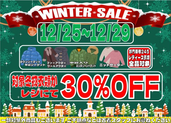 古着部門セールのお知らせ。 12/25〜29の間、対象冬物衣類が表示価格よりレジにて30%オフのセールを行います。 ※一部対象外商品もございます。 **************** こちら↓もぜひチェックしてみてください…