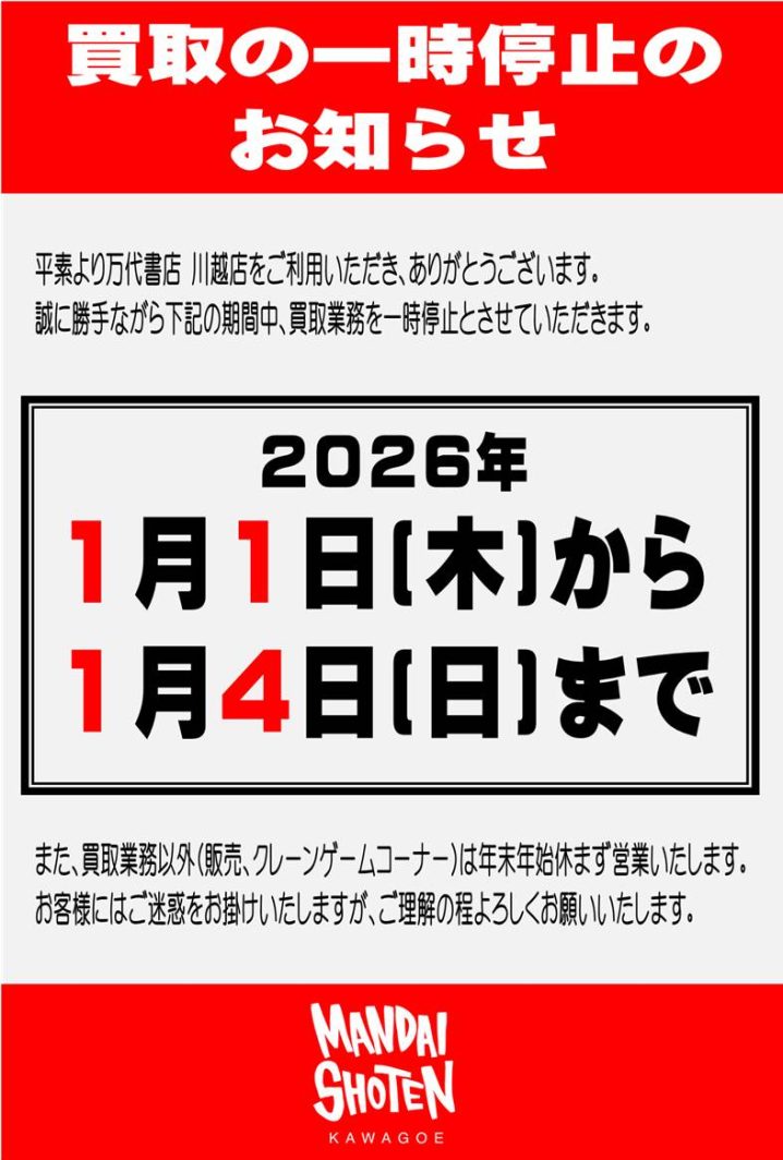 買取一時停止のお知らせ 買取業務以外は(販売、クレーンゲームコーナー)は年末年始休まず営業いたします。 お客様にはご迷惑おかけいたしますが、ご理解のほどお願いいたします。