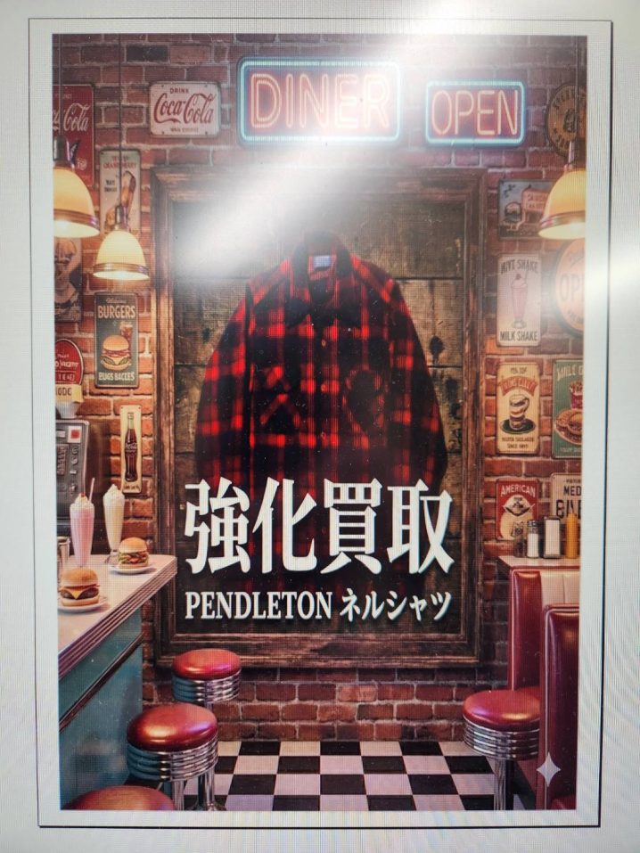古着部門 アメカジコーナー買取告知 PENDLETONのネルシャツ、ミリタリー物のタイガーストライプやカモ柄のカーゴパンツ強化買取中です。