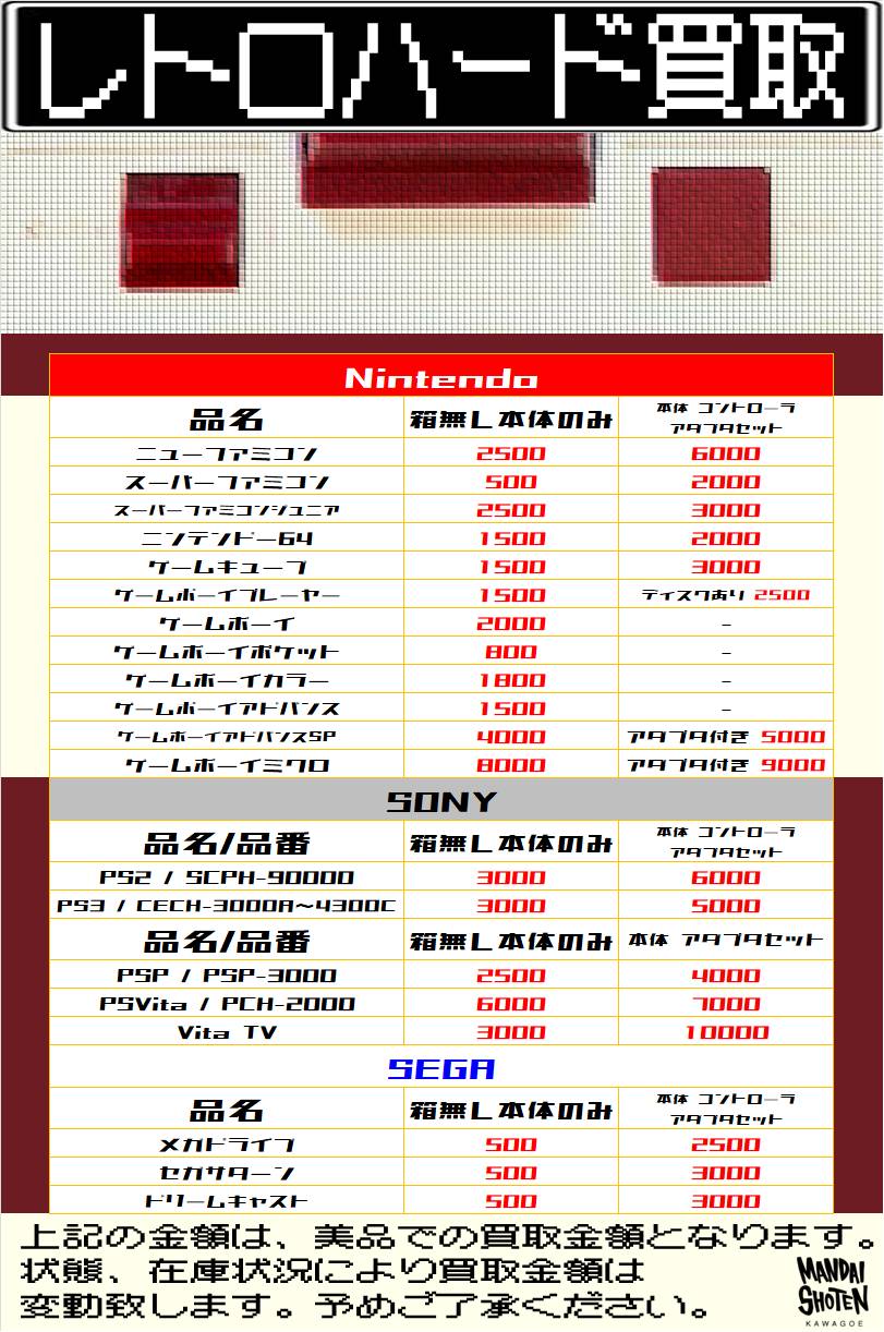 レトロソフト レトロハード WEBチラシ 2025/2/28 更新 ★宅配買取の詳細はこちら★ 近隣にお住まいで大型商品や大量の品物の査定をご希望でしたら、ご自宅に取りに伺う事も可能です! ★出張買取の詳細はこちら★ 2021年9月より 店舗改装の為、当面の間出張買取の対応を中止させて頂きます。 ご不便をお掛けして申し訳ありませんが、ご理解下さいませ。 **************