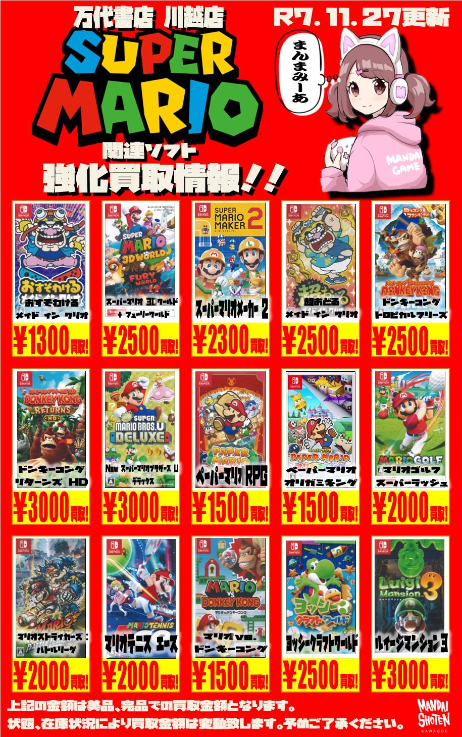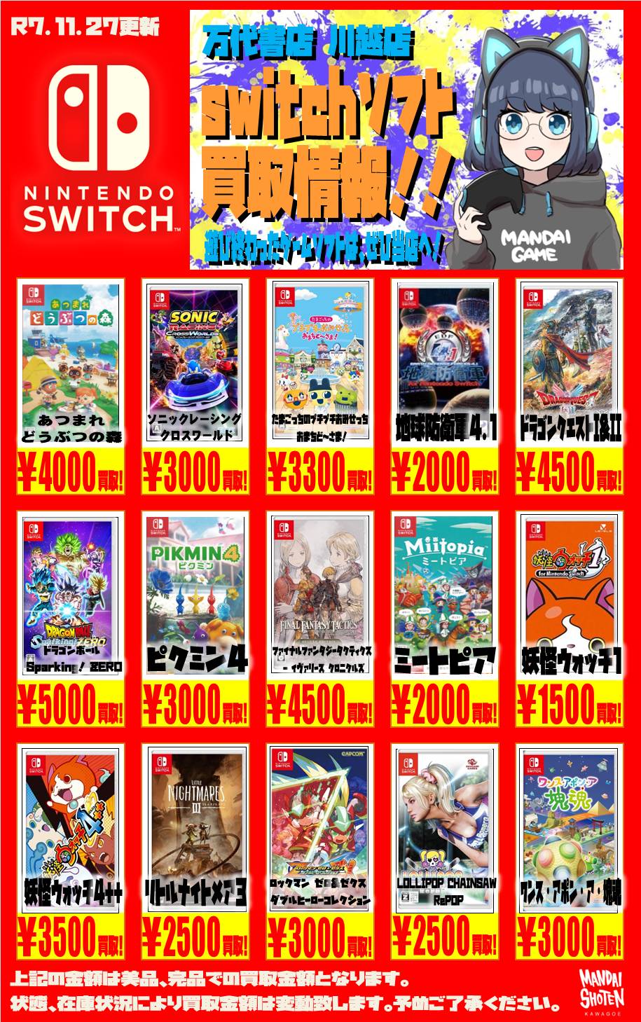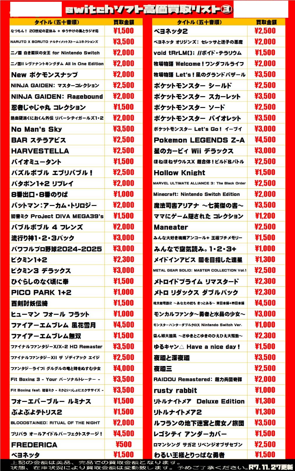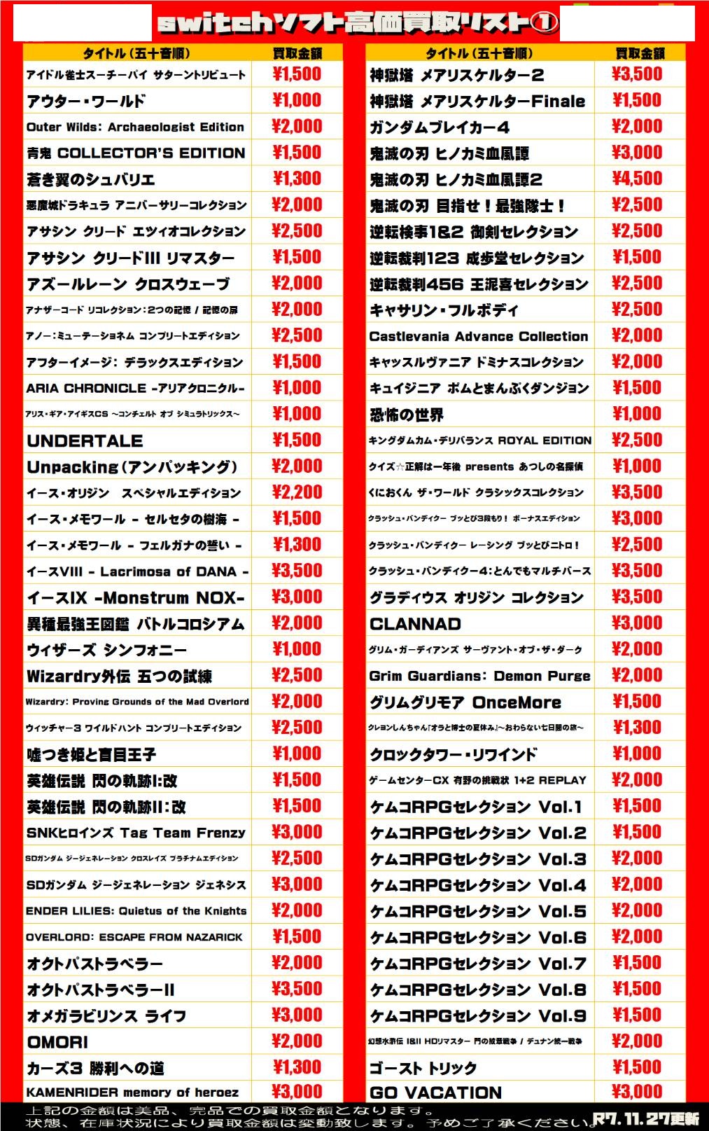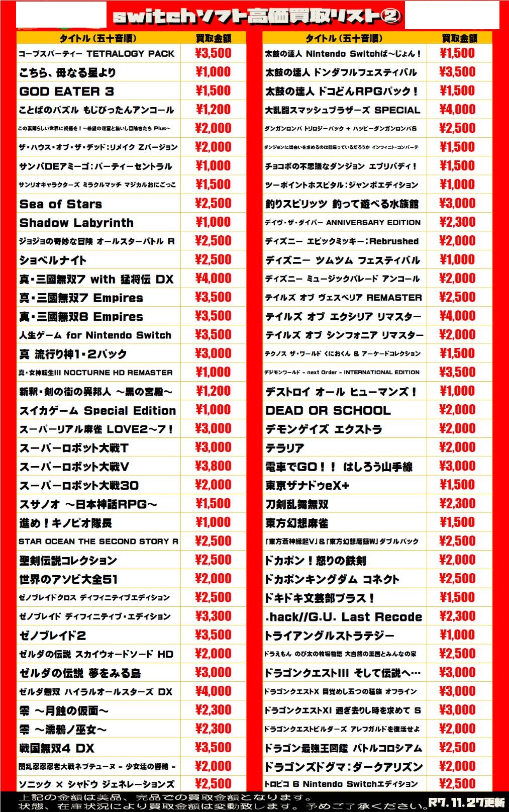 任天堂系ゲームソフト WEBチラシ 2025/11/27 更新 ★宅配買取の詳細はこちら★ 近隣にお住まいで大型商品や大量の品物の査定をご希望でしたら、ご自宅に取りに伺う事も可能です! ★出張買取の詳細はこちら★ 2021年9月より 店舗改装の為、当面の間出張買取の対応を中止させて頂きます。 ご不便をお掛けして申し訳ありませんが、ご理解下さいませ。 **************