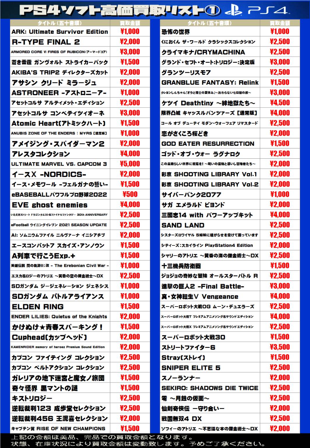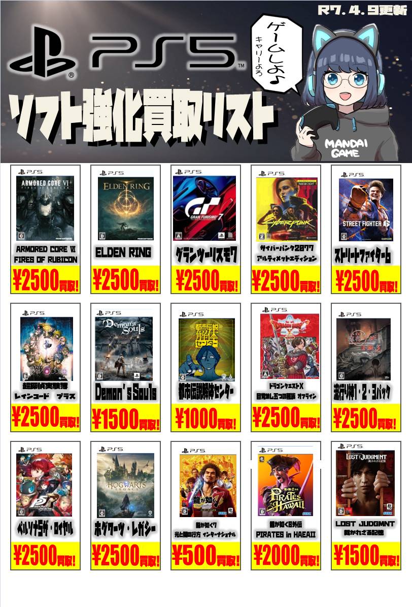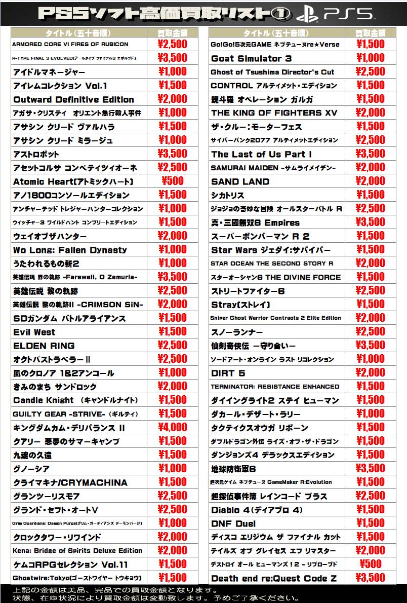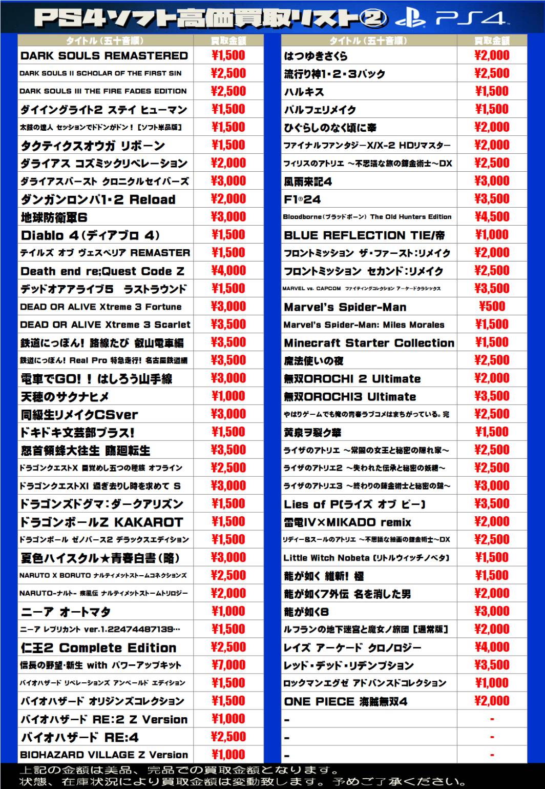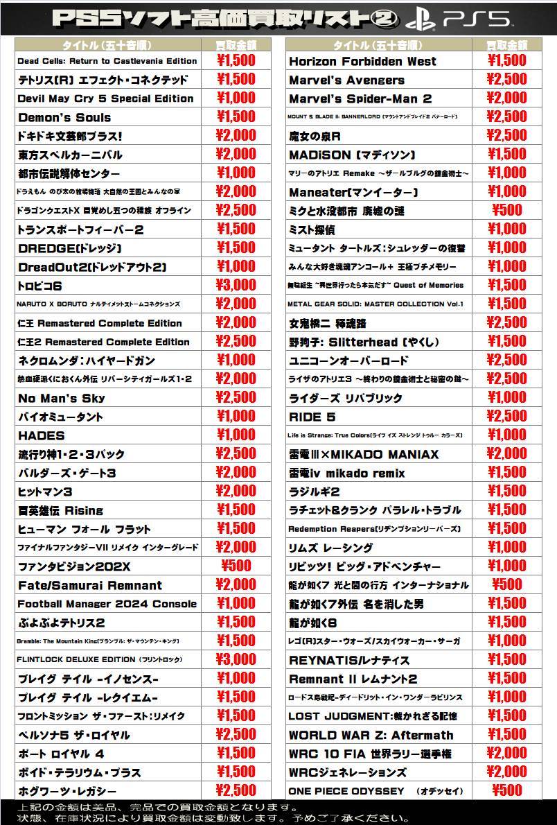 sony系ゲームソフト WEBチラシ 2025/12/25 更新 ★宅配買取の詳細はこちら★ 近隣にお住まいで大型商品や大量の品物の査定をご希望でしたら、ご自宅に取りに伺う事も可能です! ★出張買取の詳細はこちら★ 2021年9月より 店舗改装の為、当面の間出張買取の対応を中止させて頂きます。 ご不便をお掛けして申し訳ありませんが、ご理解下さいませ。 **************