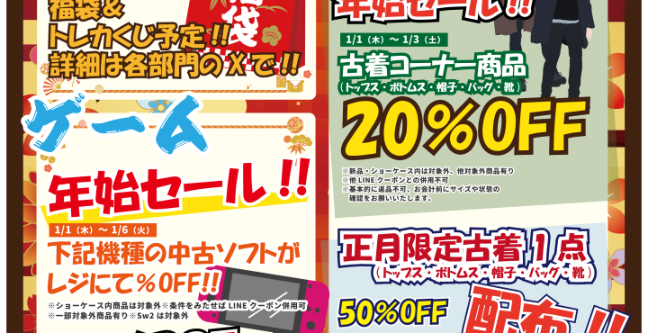 万代書店熊谷店と クレーンゲーム倉庫熊谷店は 年末年始のイベント盛りだくさん!! 各種イベント情報はチラシを確認してください!! また、各部門ごとのSNSも要チェックです!! ↓↓↓LINEのお友達登録はこちら↓↓↓ h…