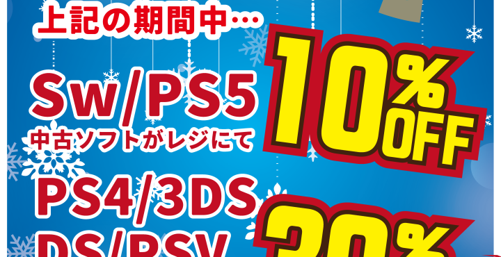 12/20(土)~12/25(木)まで Sw/PS5の中古ソフトがレジにて10%OFF!! PS4/3DS/DS/PSV/PSPの中古ソフトがレジにて30%OFF!! ※ショーケース内、特価品、ソフトのみの商品は対象外 …