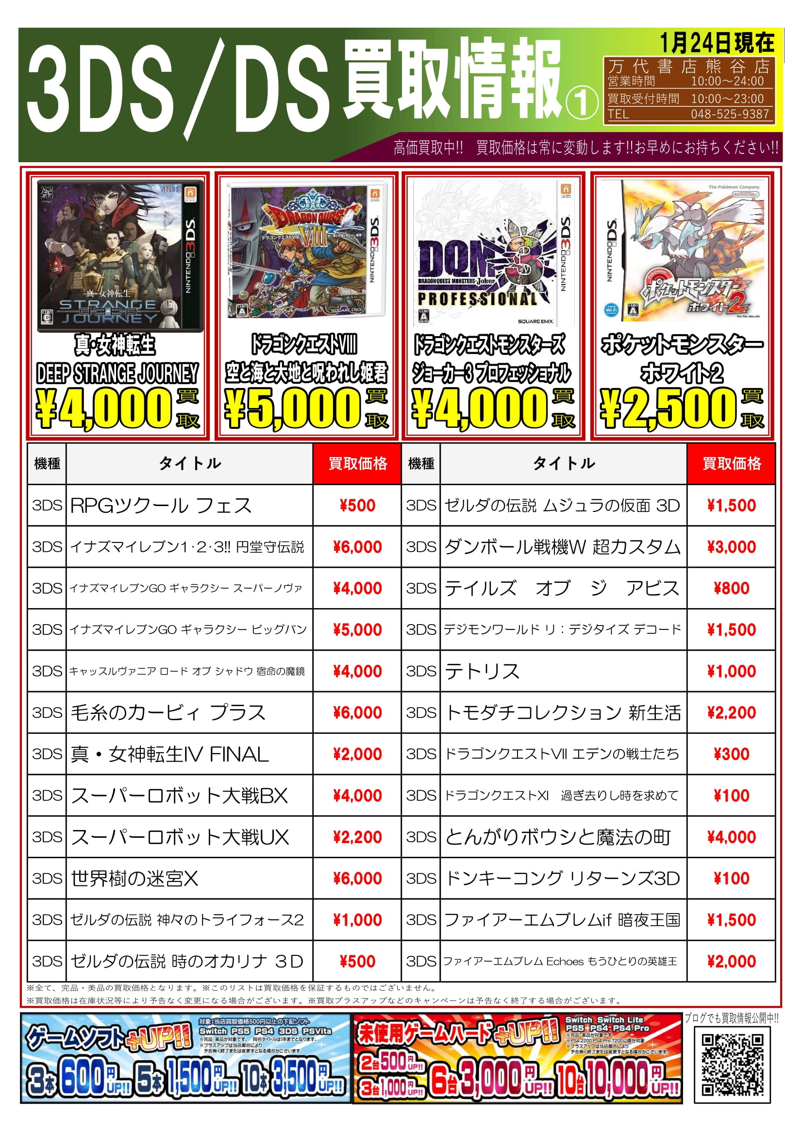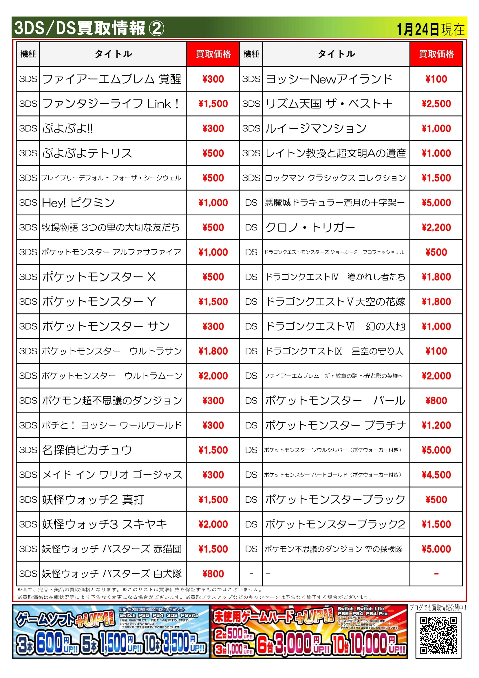 2025.01.25 買取告知 master_kumagaya ★3DS/DSソフト買取告知です!★ ★買取情報★ ※2025/1/25現在の価格となります。 在庫状況・状態によってお値段が変動いたします。予めご了承ください。 *************** こちら↓もぜひチェックしてみてくださいね♪(*´▽`*) ・最新のイベント情報はこちら ・最新の買取情報はこちら コメントを残す コメントをキャンセルメールアドレスが公開されることはありません。 ※ が付いている欄は必須項目ですコメント ※ 名前 ※ メール ※ サイト 新しいコメントをメールで通知 新しい投稿をメールで受け取る Δ