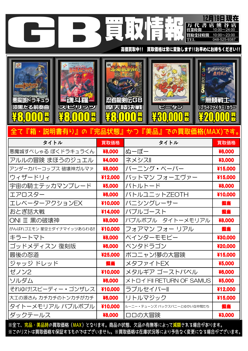2025.12.19 買取告知 takalab_1 【ゲーム】WEBチラシ更新しました!★GBソフト★ WEBチラシ更新しました!★GBソフト★ ※2025/12/19現在の価格となります。 在庫状況・状態によってお値段が変動いたします。予めご了承ください。 *************** こちら↓もぜひチェックしてみてくださいね♪(*´▽`*) ・最新のイベント情報はこちら ・最新の買取情報はこちら コメントを残す コメントをキャンセルメールアドレスが公開されることはありません。 ※ が付いている欄は必須項目ですコメント ※ 名前 ※ メール ※ サイト 新しいコメントをメールで通知 新しい投稿をメールで受け取る Δ