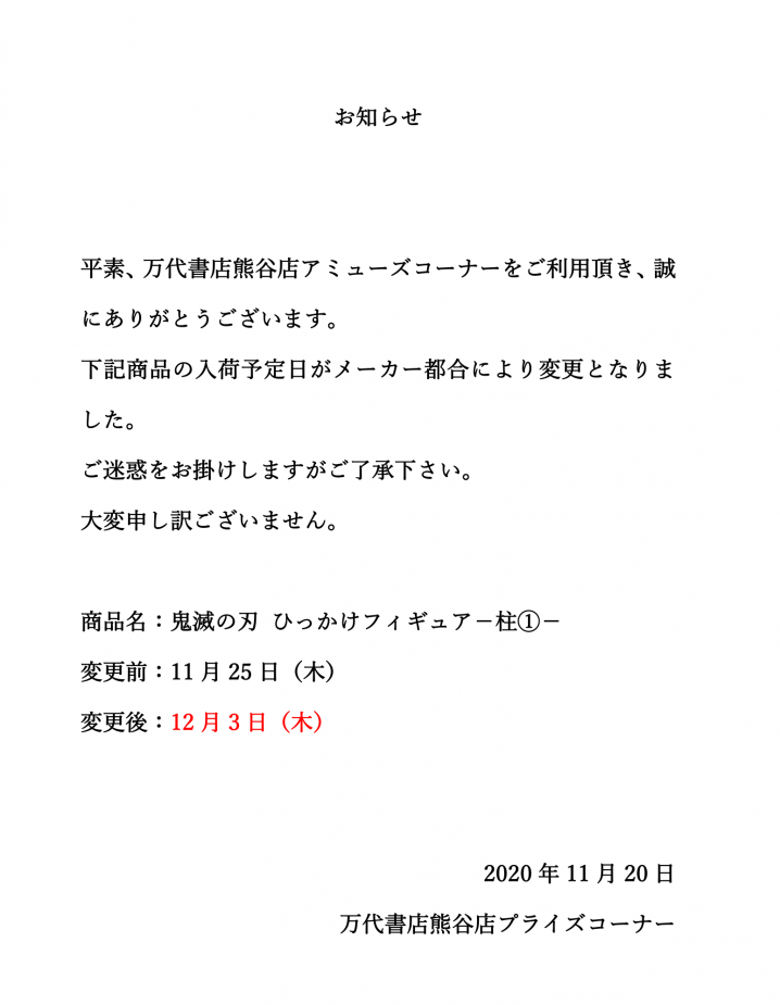下記商品の入荷予定日が変更になりましたことをお詫び申し上げます。