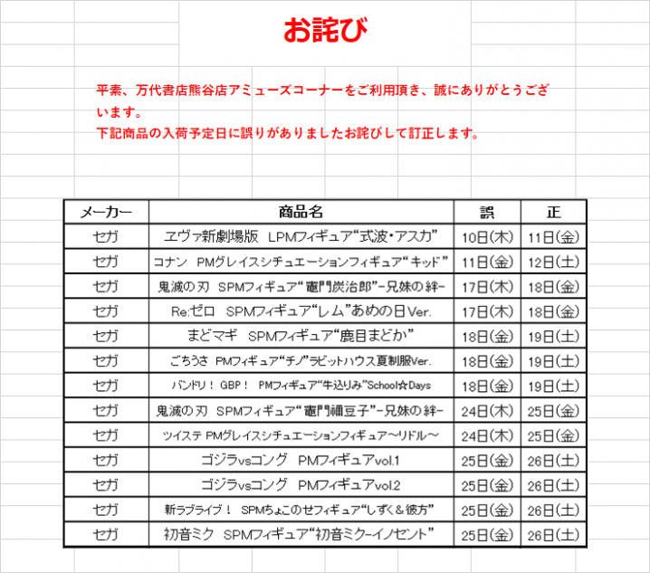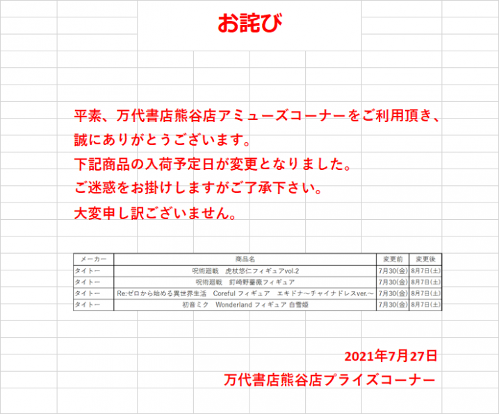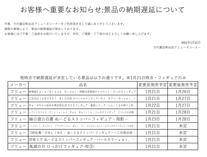 【アミューズ】7/27■≪重要≫景品入荷予定日変更のお知らせです!≪重要≫■