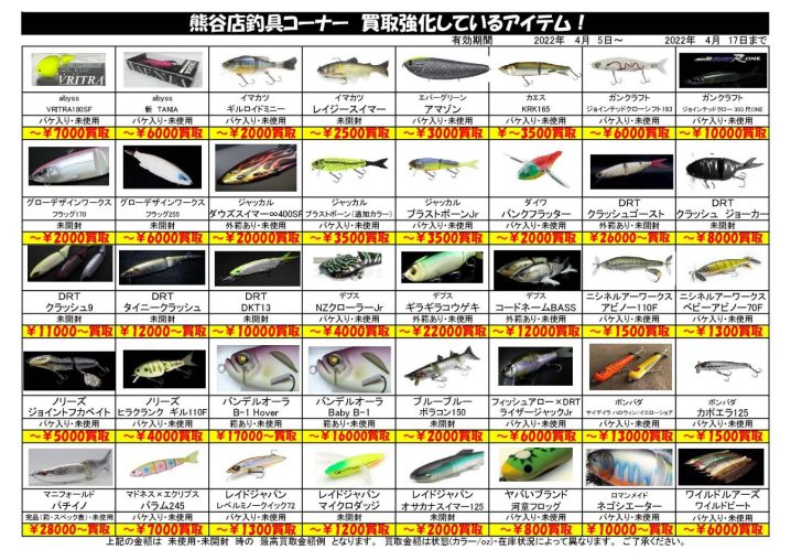 釣具買取チラシ更新しました。 ※2022/4/5 現在の買取価格となります。 在庫状況・状態によってお値段が変動いたします。予めご了承ください。 *************** こちら↓もぜひチェックしてみてくださいね♪…