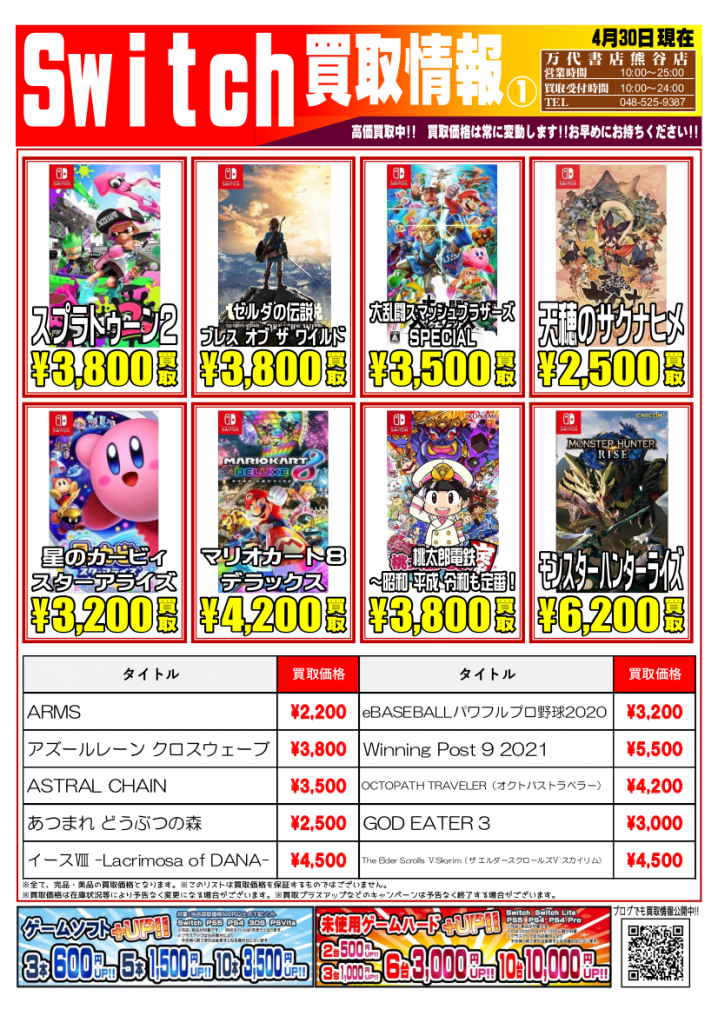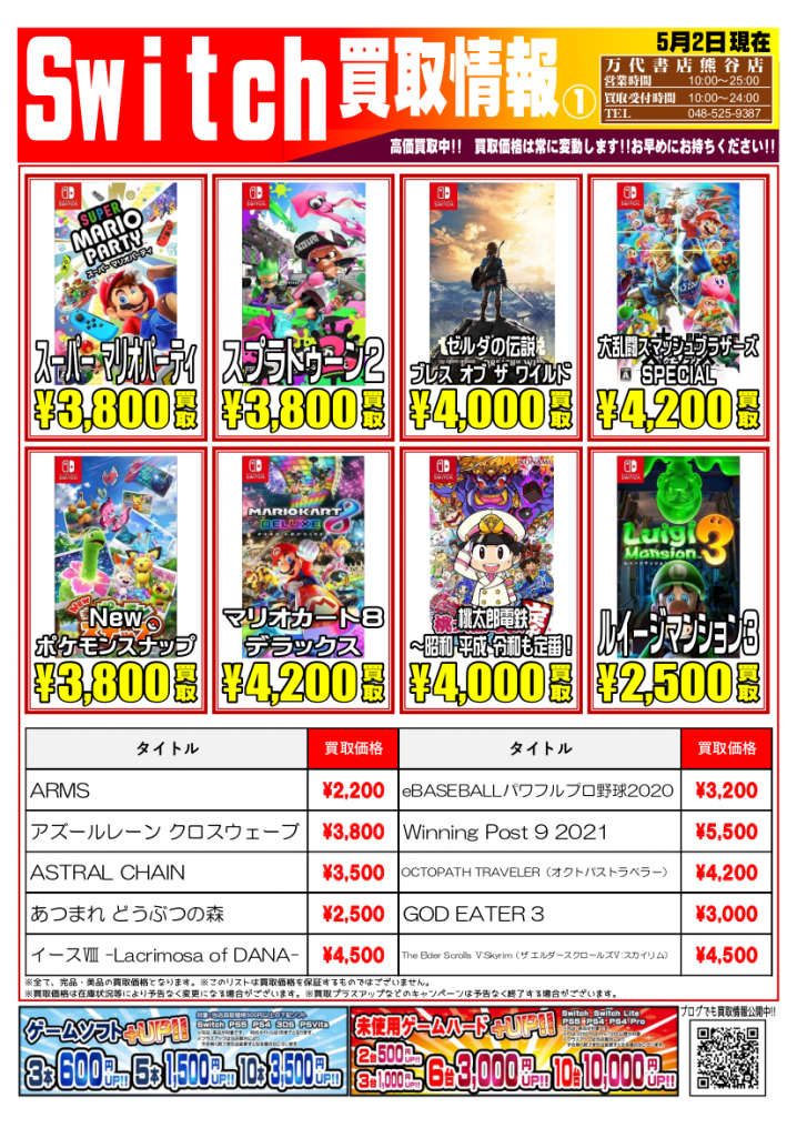 ニンテンドーSwitchソフトの買取告知更新しました! ※2021/5/3現在の買取価格となります。 在庫状況・状態によってお値段が変動いたします。予めご了承ください。 *************** こちら↓もぜひチェ…