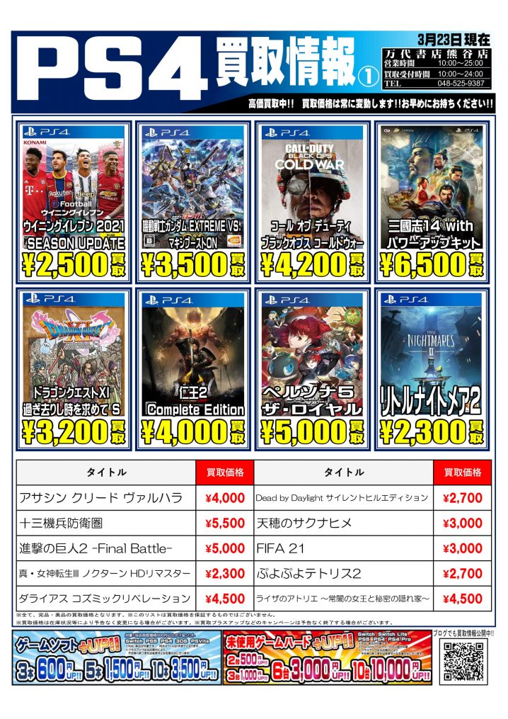 ★買取情報★ ゲーム買取告知の更新をいたしました! ※2021/3/23現在の買取価格となります。 在庫状況・状態によってお値段が変動いたします。予めご了承ください。 *************** こちら↓もぜひチェッ…
