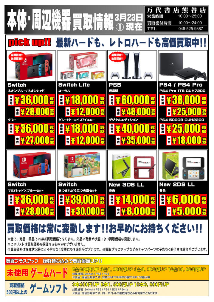 ⭐WEBチラシ更新しました!!⭐ 買取お待ちしております(/・ω・)/ ※2021/3/23 現在の買取価格となります。 在庫状況・状態によってお値段が変動いたします。予めご了承…