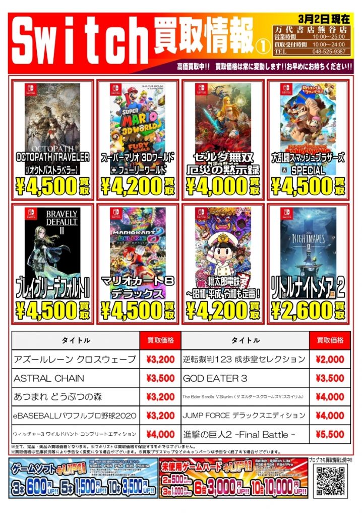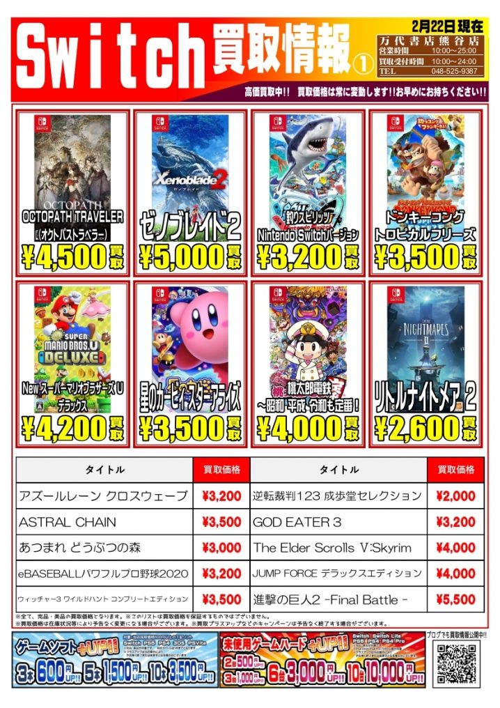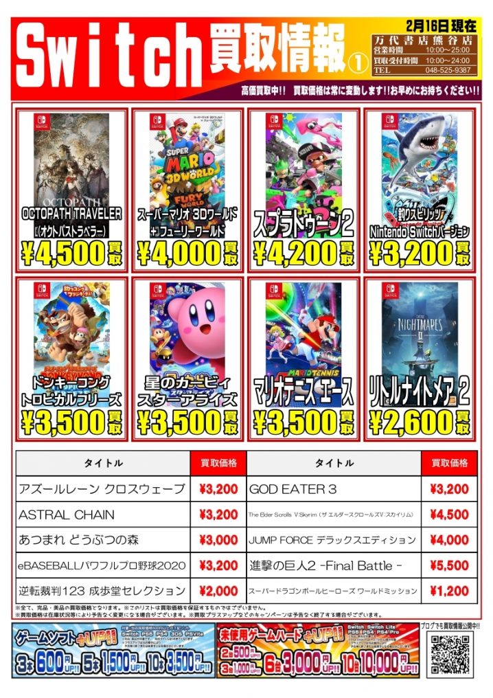 ニンテンドーSwitchソフトの買取告知更新しました! 皆様からの買取じゃんじゃんお待ちしております(∩´∀`)∩ ※2021/3/2現在の買取価格となります。 在庫状況・状態によってお値段が変動いたします…