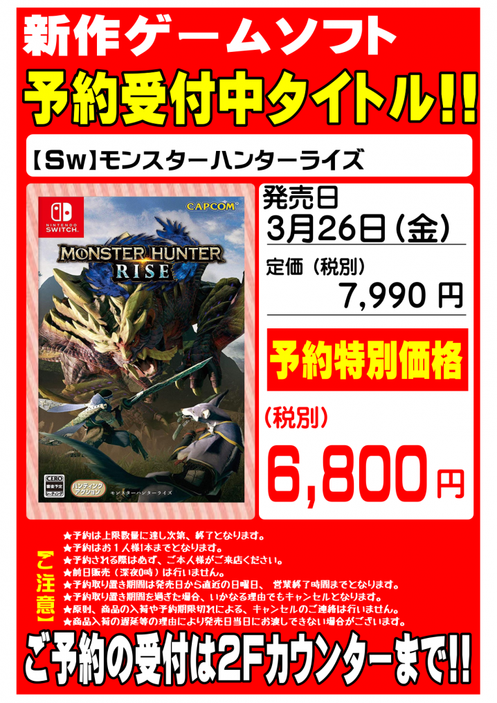 ニンテンドーSwitchソフト《モンスターハンターライズ》 予約受付中です! ※このリストは2/19時点での予約可能タイトルとなります。 <<ご予約する上でのご注意>> ・ご予約は店…