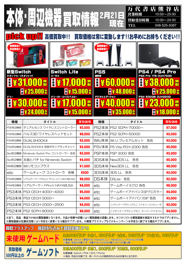 ⭐WEBチラシ更新しました!!⭐ ※2021/2/23 現在の買取価格となります。 在庫状況・状態によってお値段が変動いたします。予めご了承ください。 *************** こちら↓…