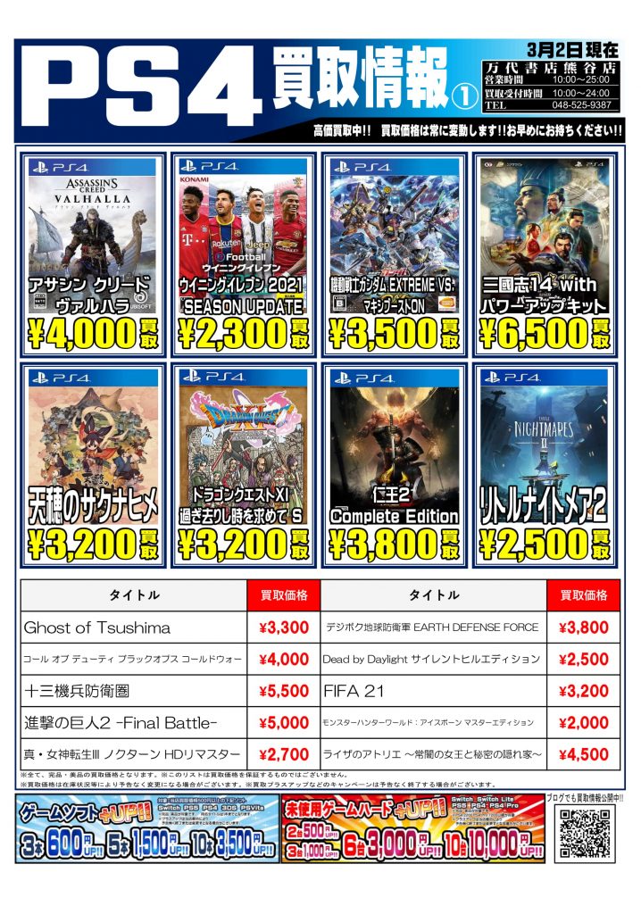 ニンテンドーSwitch|PS4ソフトの買取告知更新しました! 皆様からの買取じゃんじゃんお待ちしております(∩´∀`)∩ ※2021/2/16現在の買取価格となります。 在庫状況・状態によってお値段が変動いたします。予…