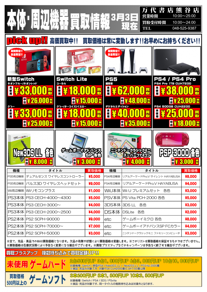 ⭐WEBチラシ更新しました!!⭐ 買取お待ちしております(/・ω・)/ ※2021/3/2 現在の買取価格となります。 在庫状況・状態によってお値段が変動いたします。予めご了承く…