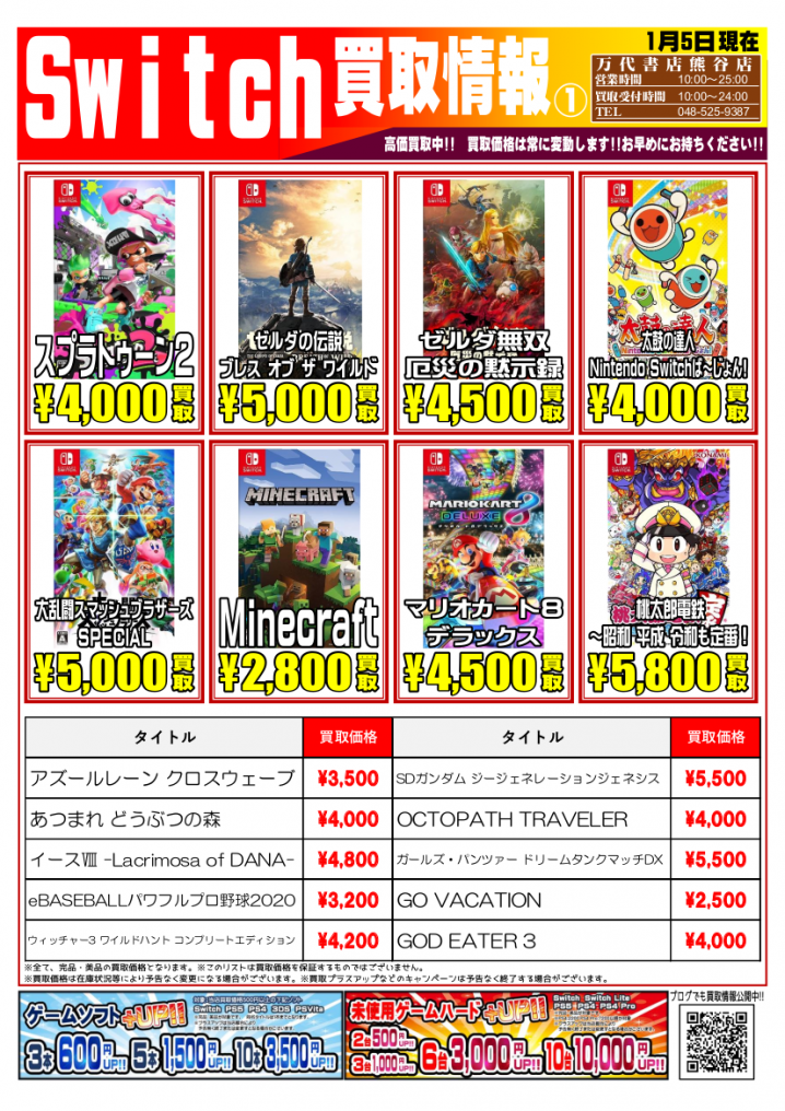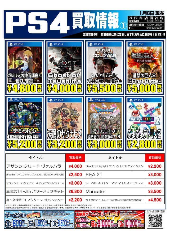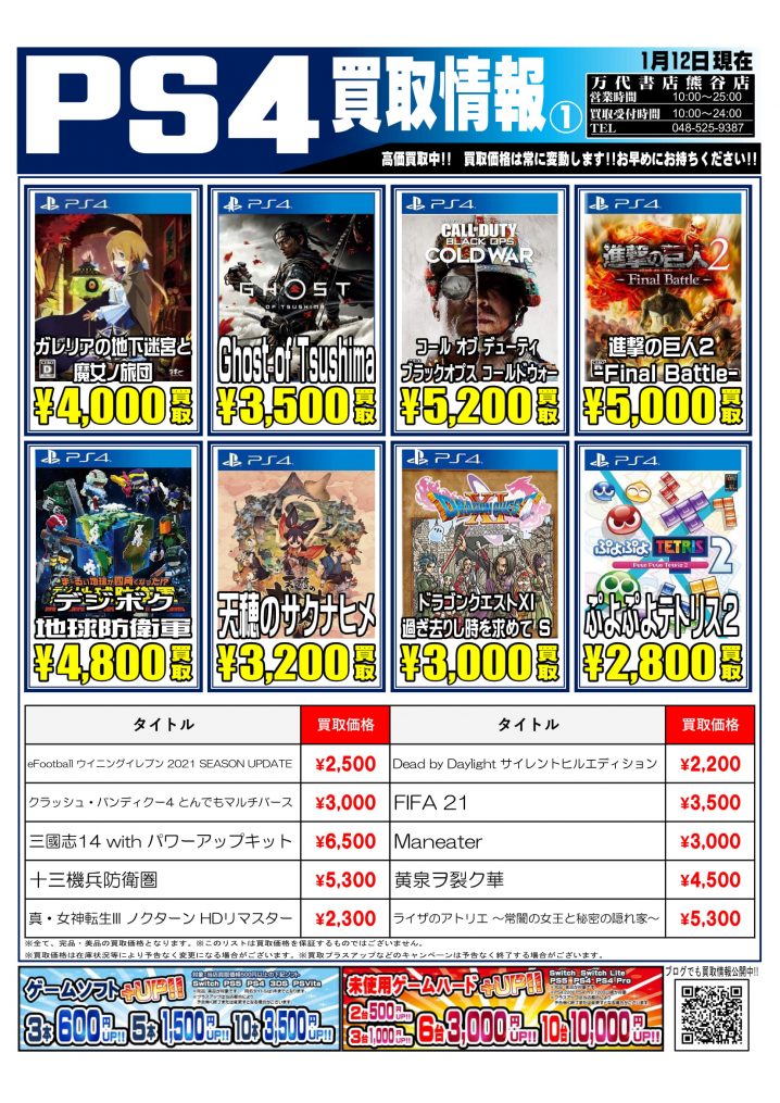 ★買取情報★ ゲーム買取告知更新いたしました! ※2021/1/11現在の買取価格となります。 在庫状況・状態によってお値段が変動いたします。予めご了承ください。