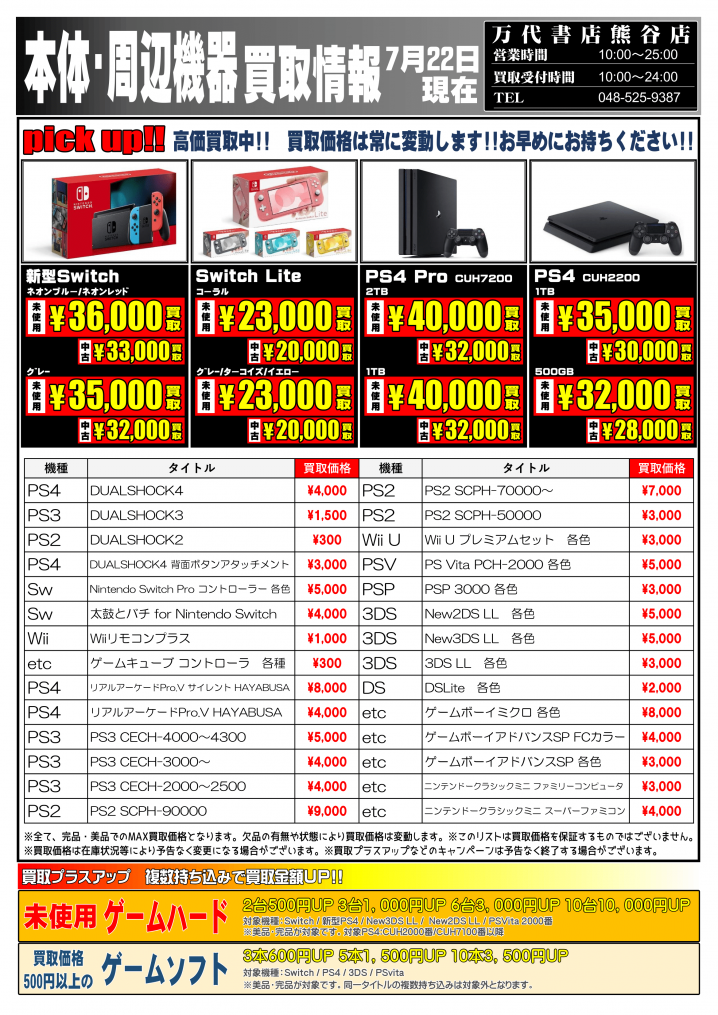 ゲーム機本体、周辺機器の買取告知更新しました°˖✧◝(⁰▿⁰)◜✧˖° 掲載外商品も買取大募集中です! 皆様からの買取じゃんじゃんお待ちしております(∩´∀`)∩ ※2020/7/24現在の買取価格となりま…