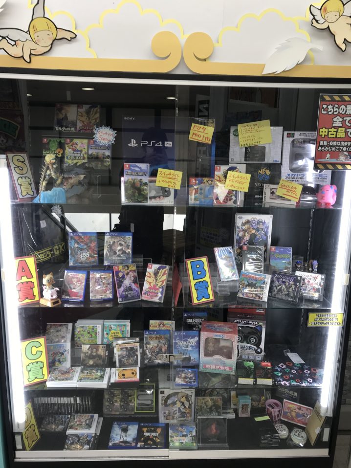 本日(3/13)時点でのゲームガチャの景品です! PS4proやスイッチライト+ソフトのセットなど! 豪華景品盛りだくさんです! 当店へお越しの際は是非、回しちゃってください(*´ω`*)