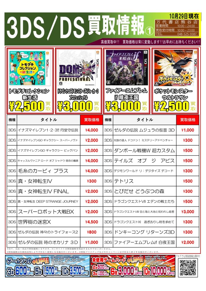 🎮3DSソフトの買取告知更新しました!🎮 ※2023/10/30現在の価格となります。 在庫状況・状態によってお値段が変動いたします。予めご了承ください。 *************** …