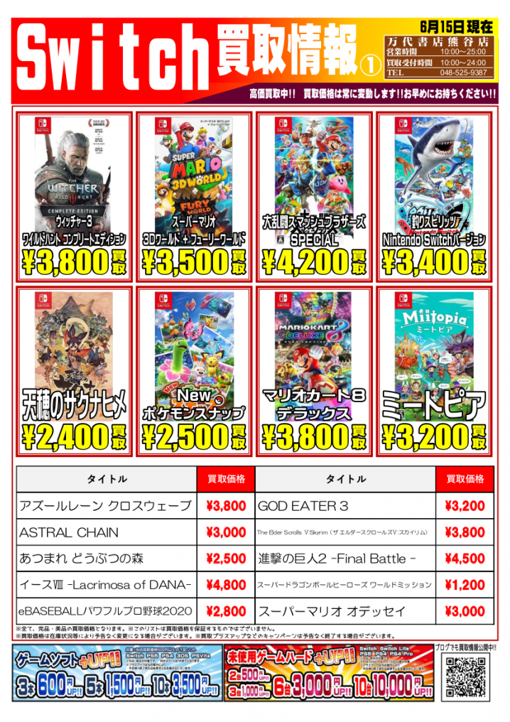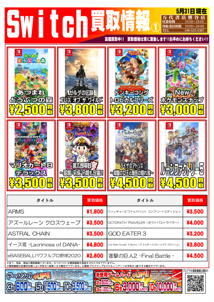 Switchソフトの買取告知更新しました! 皆様からの買取じゃんじゃんお待ちしております(∩´∀`)∩ ※2021/5/24現在の買取価格となります。 在庫状況・状態によってお値段が変動いたします。予めご了…
