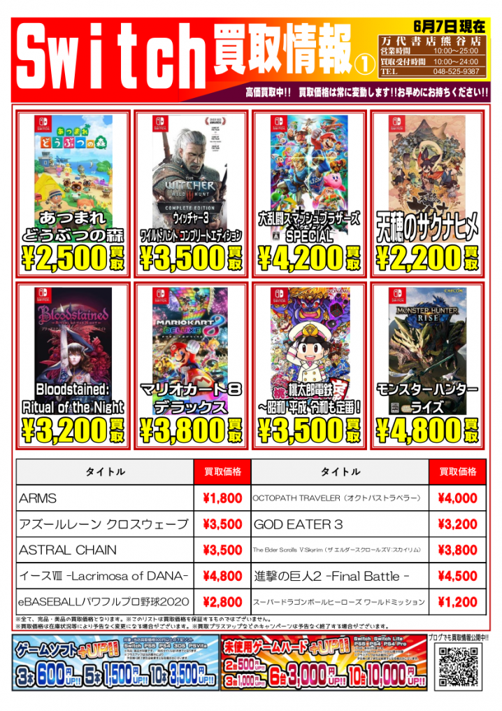 ニンテンドーSwitchソフトの買取告知更新しました! 皆様からの買取じゃんじゃんお待ちしております!(*^▽^*) ※2021/6/7現在の買取価格となります。 在庫状況・状態によってお値段が変動いたしま…