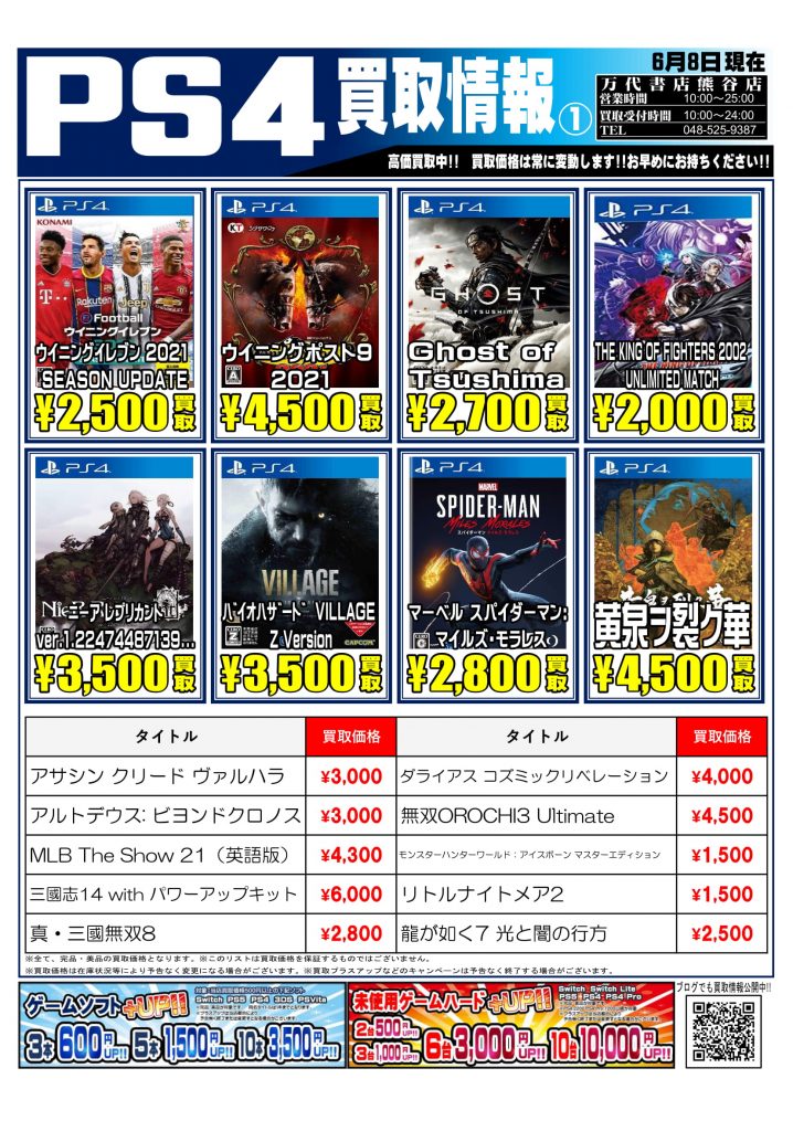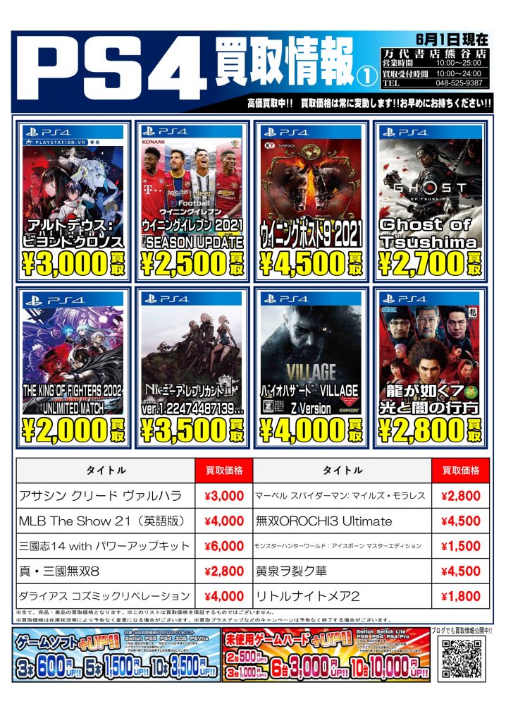 ニンテンドーSwitch|PS4ソフトの買取告知更新しました! 皆様からの買取じゃんじゃんお待ちしております(∩´∀`)∩ ※2021/6/15現在の買取価格となります。 在庫状況・状態によってお値段が変動…