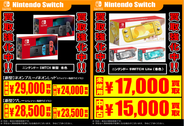 ✨Switch・SwitchLite買取情報更新✨ 是非当店にお持ちください!(o*。_。)o ※2020/1/28 現在の買取価格となります。 在庫状況・状態によってお値段が変…