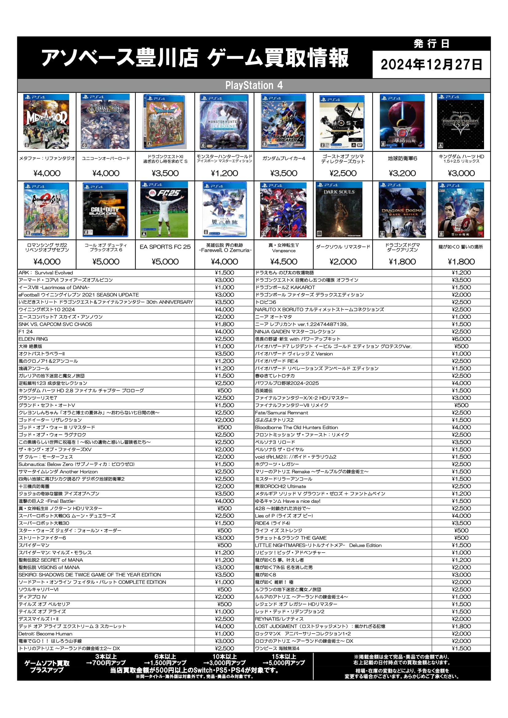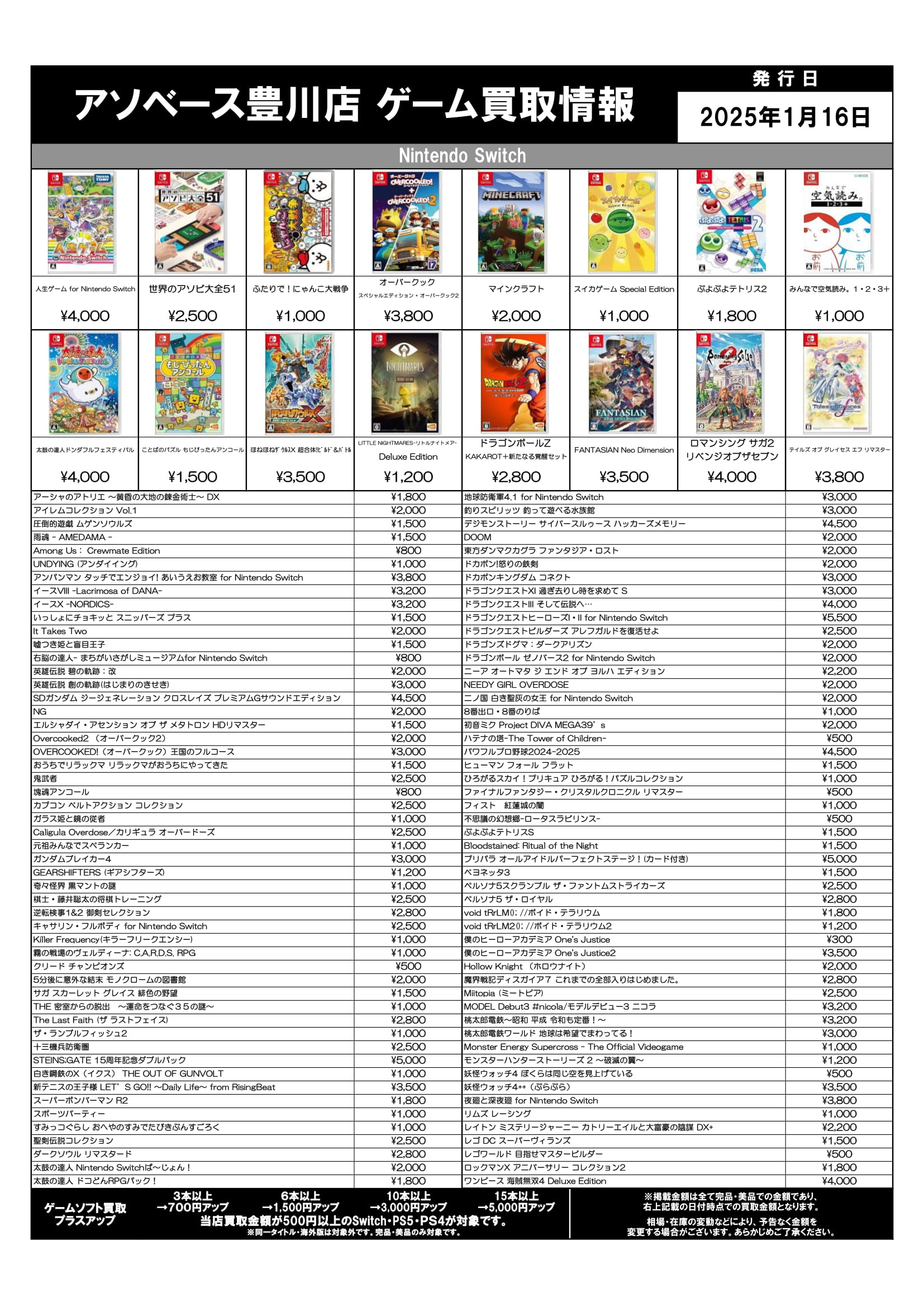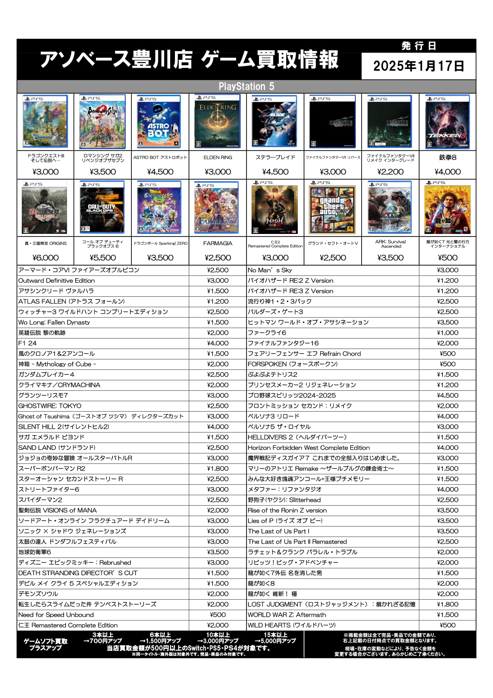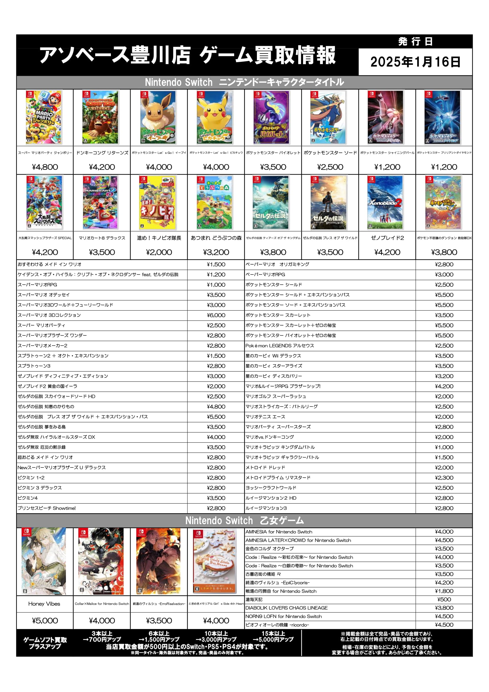 【アソベース豊川店】ゲーム買取情報の更新です! new アソベース豊川店 豊川店 買取情報 豊川店 ゲーム 2025年1月18日 🎮ゲーム買取情報の更新です!🎮 アソベース豊川ではSwitch/PS4/PS5の本体やソフトの買取をしております! ゲームを売るのも買うのもアソベース豊川で!🚀 ※2025/1/18現在の価格となります。 在庫状況・状態によってお値段が変動いたします。予めご了承ください。 **************** こちら↓もぜひチェックしてみてくださいね♪(*´▽`*) ・最新のイベント情報はこちら ・最新の買取情報はこちら
