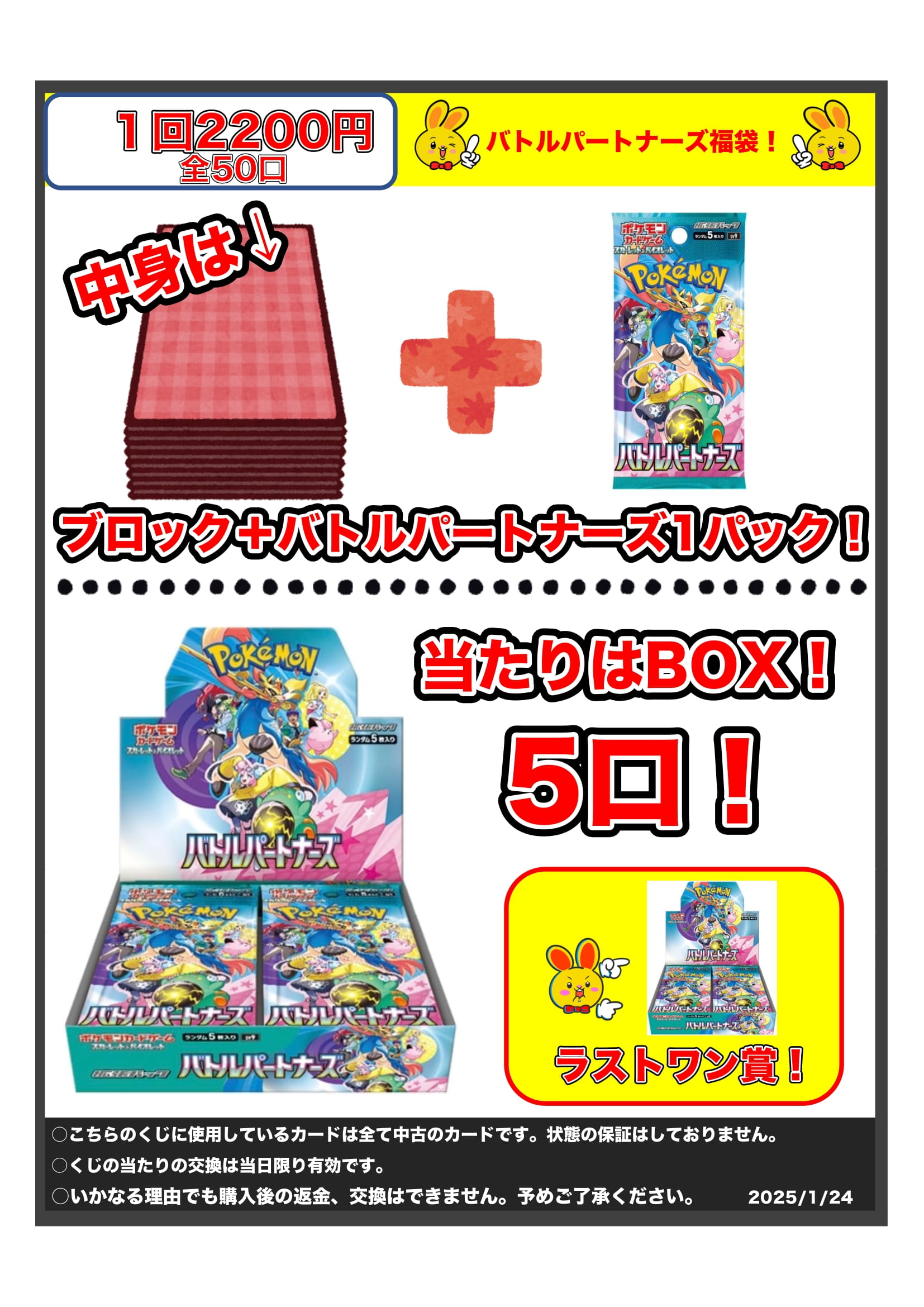 【鈴鹿店】ポケカ福袋発売中! 万代書店鈴鹿店 鈴鹿店 カード 2025年1月24日 カードコーナーより! ポケカ福袋発売中! 1回2200円 全50口! 当たればバトルパートナーズBOX✨ ハズレはブロック+バトルパートナーズ1パックです! ラストワン賞はバトルパートナーズBOXです!