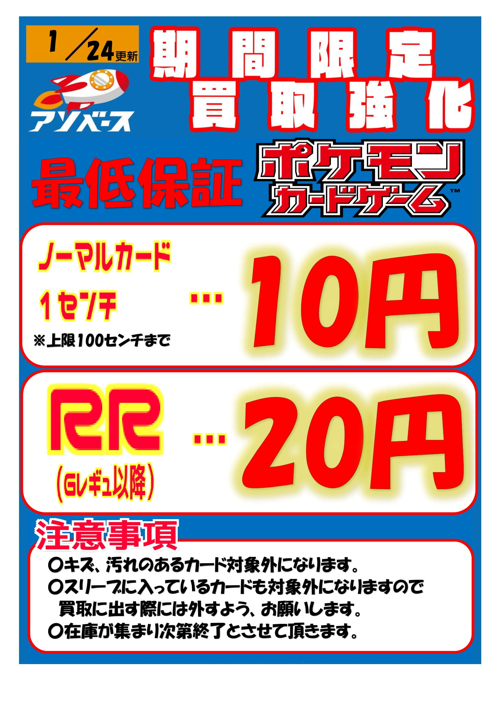 【アソベース豊川店】★ポケモンカード買取価格のお知らせ- 📢💭★★ アソベース豊川店 豊川店 買取情報 豊川店 カード 2025年1月24日 ノーマルカード1cm10円買取! RR(Gレギュ以降)1枚20円買取実施中! 是非お持ちください!🤗⭐ ※美品での価格です。在庫状況により予告なく変動する場合があります。ご了承ください。 ※2025/1/24現在の価格となります。 在庫状況・状態によってお値段が変動いたします。予めご了承ください。 **************** こちら↓もぜひチェックしてみてくださいね♪(*´▽`*) ・最新のイベント情報はこちら ・最新の買取情報はこちら