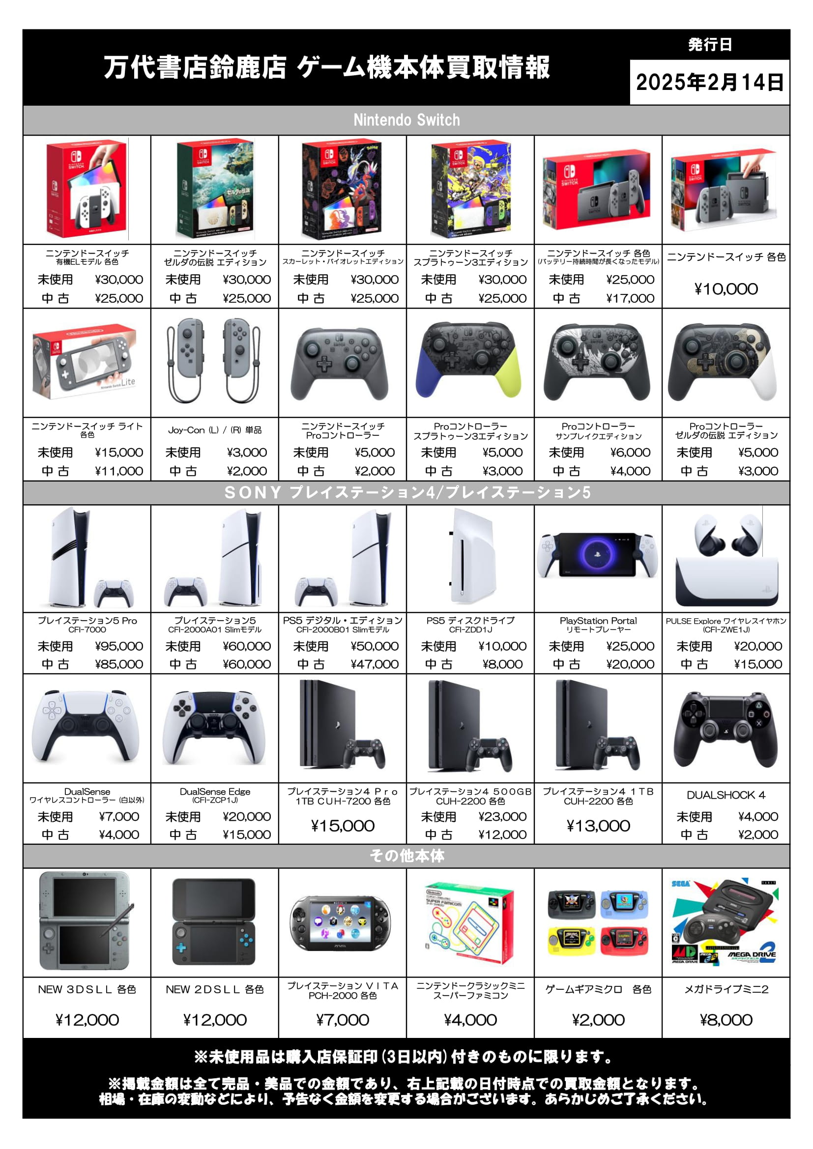 【鈴鹿店】ゲーム買取情報0214■ new 万代書店鈴鹿店 鈴鹿店 買取情報 鈴鹿店 ゲーム 2025年2月14日 ゲーム買取情報を更新しました! 遊び終わったゲーム売ってください!! ※2025/2/14現在の価格となります。 在庫状況・状態によってお値段が変動いたします。予めご了承ください。 **************** こちら↓もぜひチェックしてみてくださいね♪(*´▽`*) ・最新のイベント情報はこちら ・最新の買取情報はこちら
