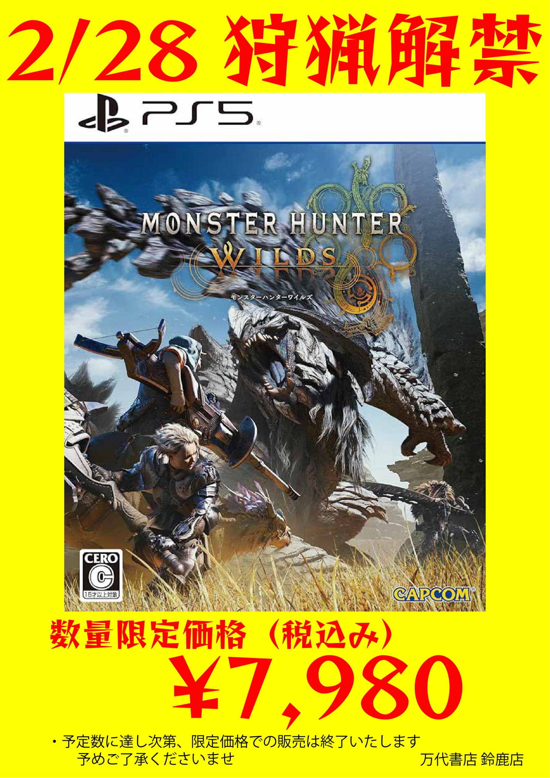 【鈴鹿店】ゲームよりお知らせ《2/28発売 モンスターハンターワイルズ(PS5版)》 new 万代書店鈴鹿店 鈴鹿店 ゲーム 2025年2月26日 【ゲームよりお知らせ】 2/28発売 モンスターハンターワイルズ(PS5版) 《数量限定》 税込 ¥7,980円で販売いたします🍖 PS5版をパッケージ版で購入を検討中の方は是非❣️ 定価¥9,900なので、かなりお得に買えちゃいます🉐 近辺のハンターの皆さまのご来店、心よりお待ちしております🙌 ※2025/2/26 現在の価格となります。 在庫状況・状態によってお値段が変動いたします。予めご了承ください。