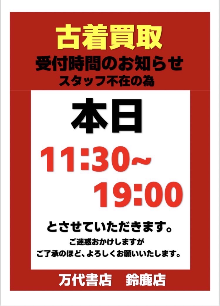 【鈴鹿店】《2月28日》古着買取受付時間のお知らせ■ new 万代書店鈴鹿店 鈴鹿店 お知らせ/ご案内 鈴鹿店 ファッション 2025年2月28日 いつも万代書店 鈴鹿店をご利用いただき、誠にありがとうございます❗🙇 本日の古着買取受付時間を上記の時間に変更致します。 ご迷惑をおかけしますが、宜しくお願い致します🙇