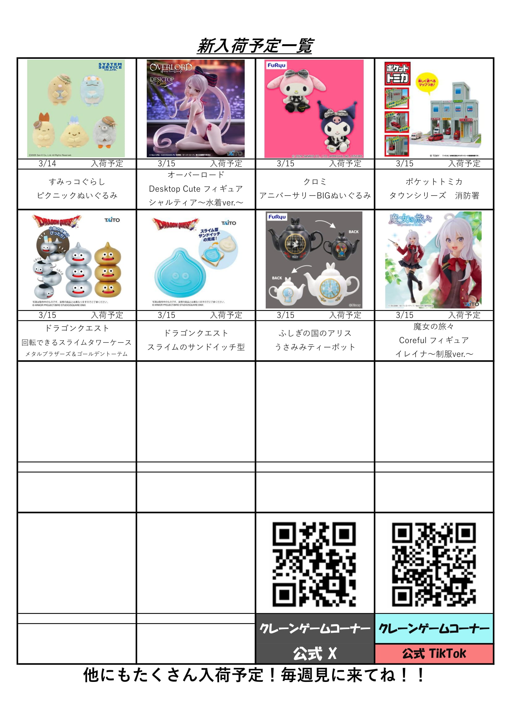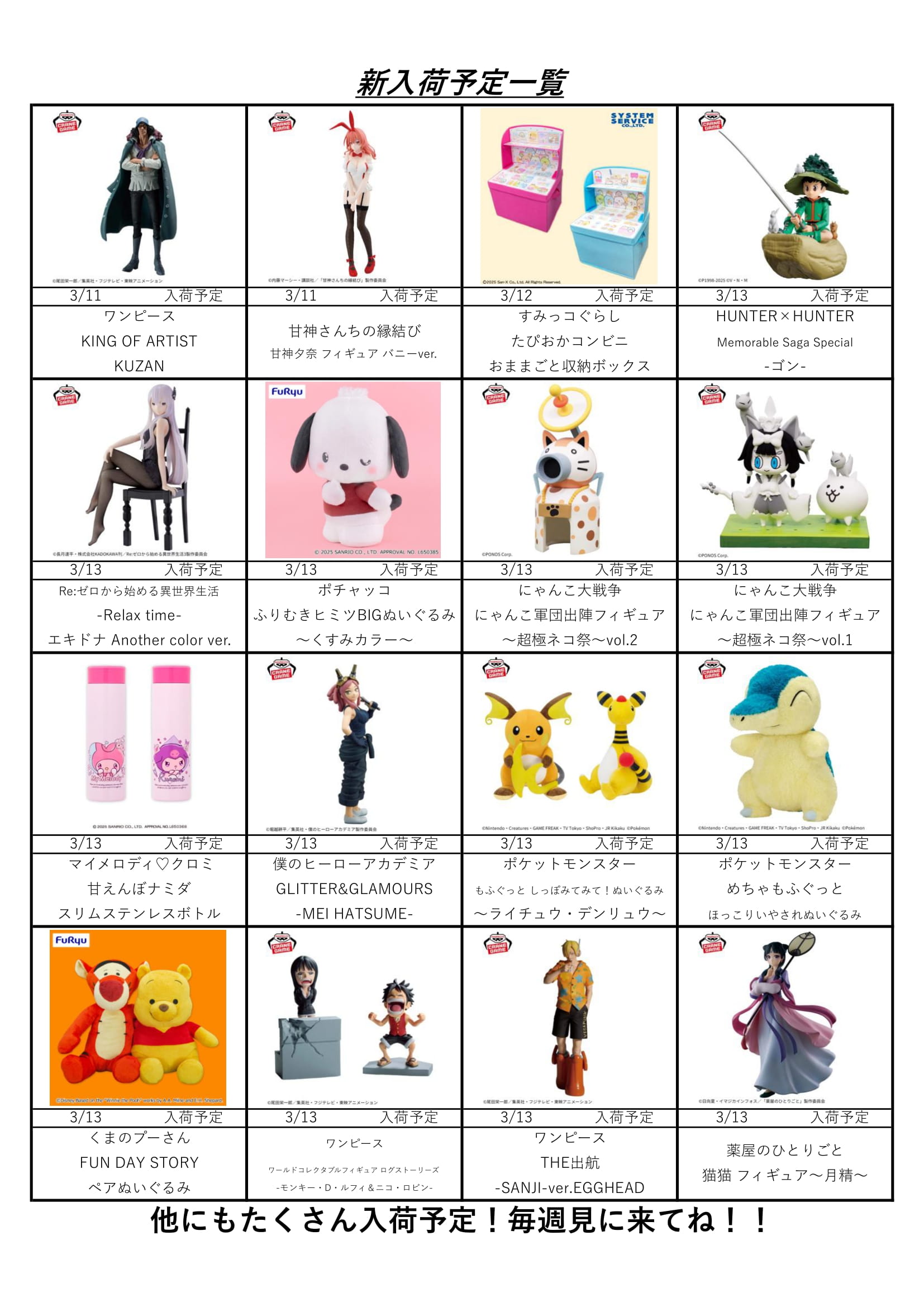 🌸クレーンゲームコーナー3月景品入荷表です!🌸