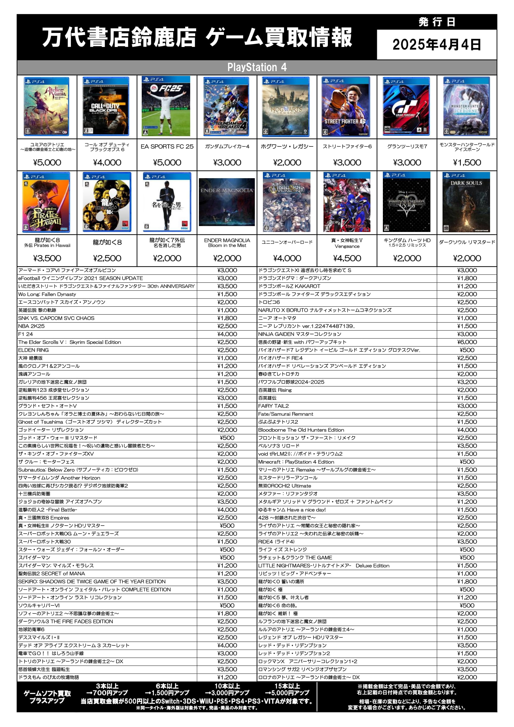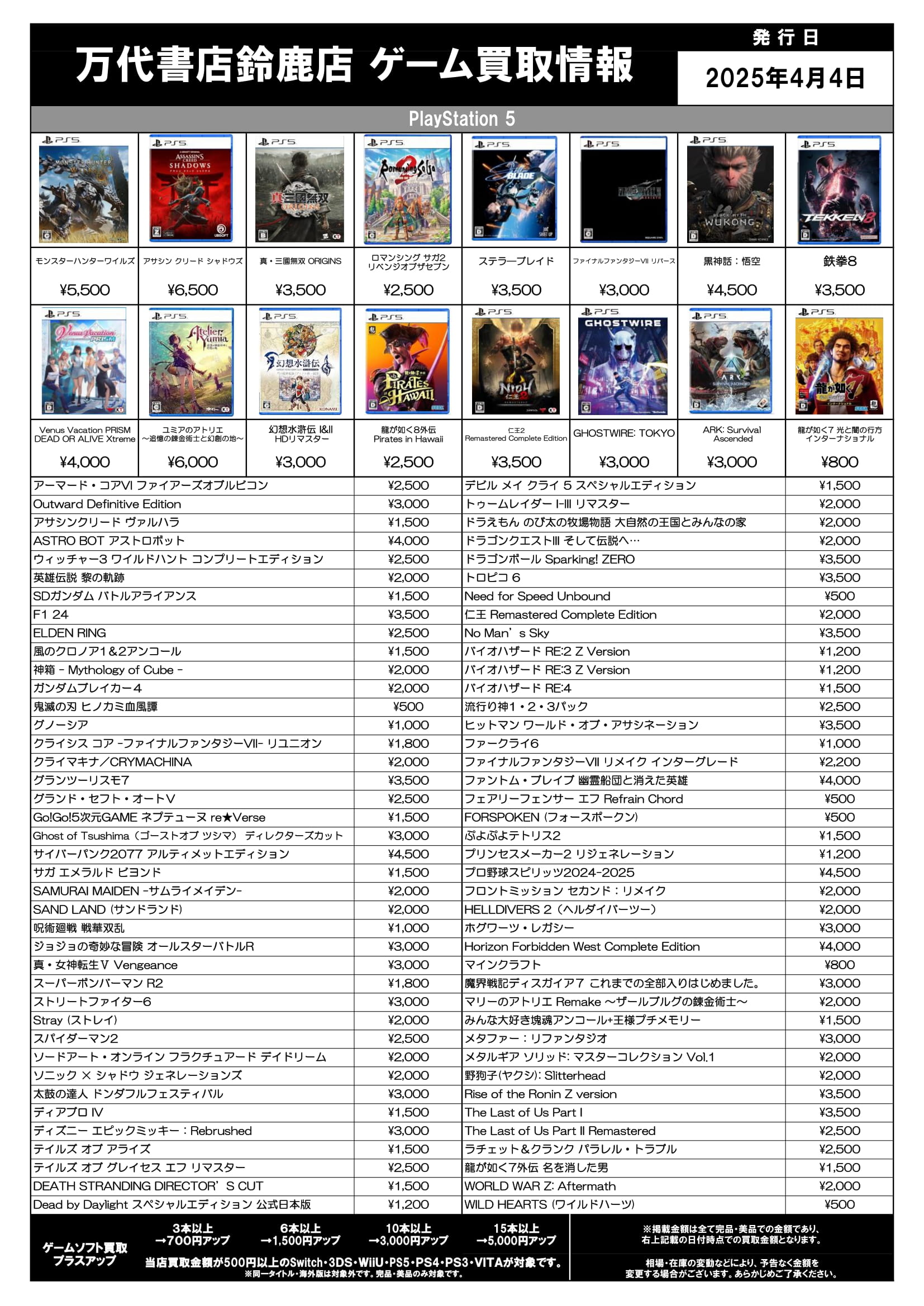 【鈴鹿店】★ゲーム買取情報0405★ new 万代書店鈴鹿店 鈴鹿店 買取情報 鈴鹿店 ゲーム 2025年4月5日 ゲーム買取情報を更新しました! 遊び終わったゲーム売ってください!! ※2025/4/5現在の価格となります。 在庫状況・状態によってお値段が変動いたします。予めご了承ください。 **************** こちら↓もぜひチェックしてみてくださいね♪(*´▽`*) ・最新のイベント情報はこちら ・最新の買取情報はこちら