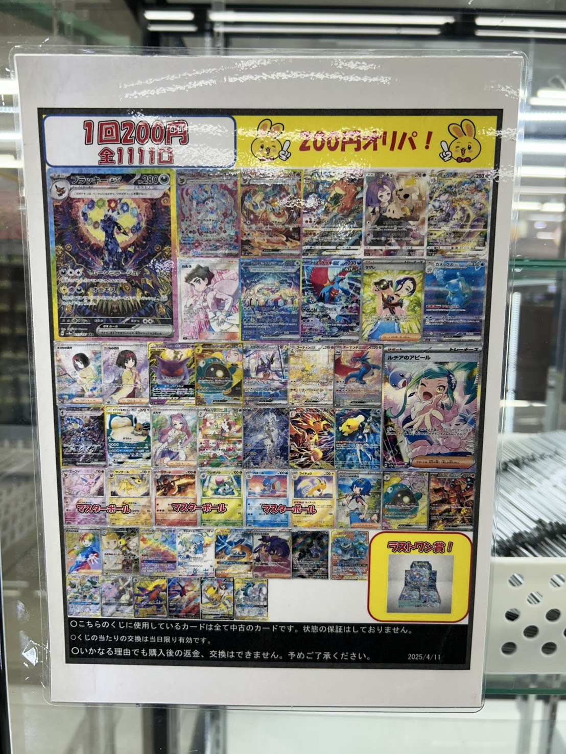 【鈴鹿店】カードコーナーより! ポケカ200円オリパ発売中! 万代書店鈴鹿店 鈴鹿店 カード 鈴鹿店 ガチャ 2025年4月11日 カードコーナーより! ポケカ200円オリパ発売中! 1回200円 全1111口! 当たりはブラッキーSARやルチアのアピールSARなど✨ ラストワン賞はステラミラクル1BOXです!