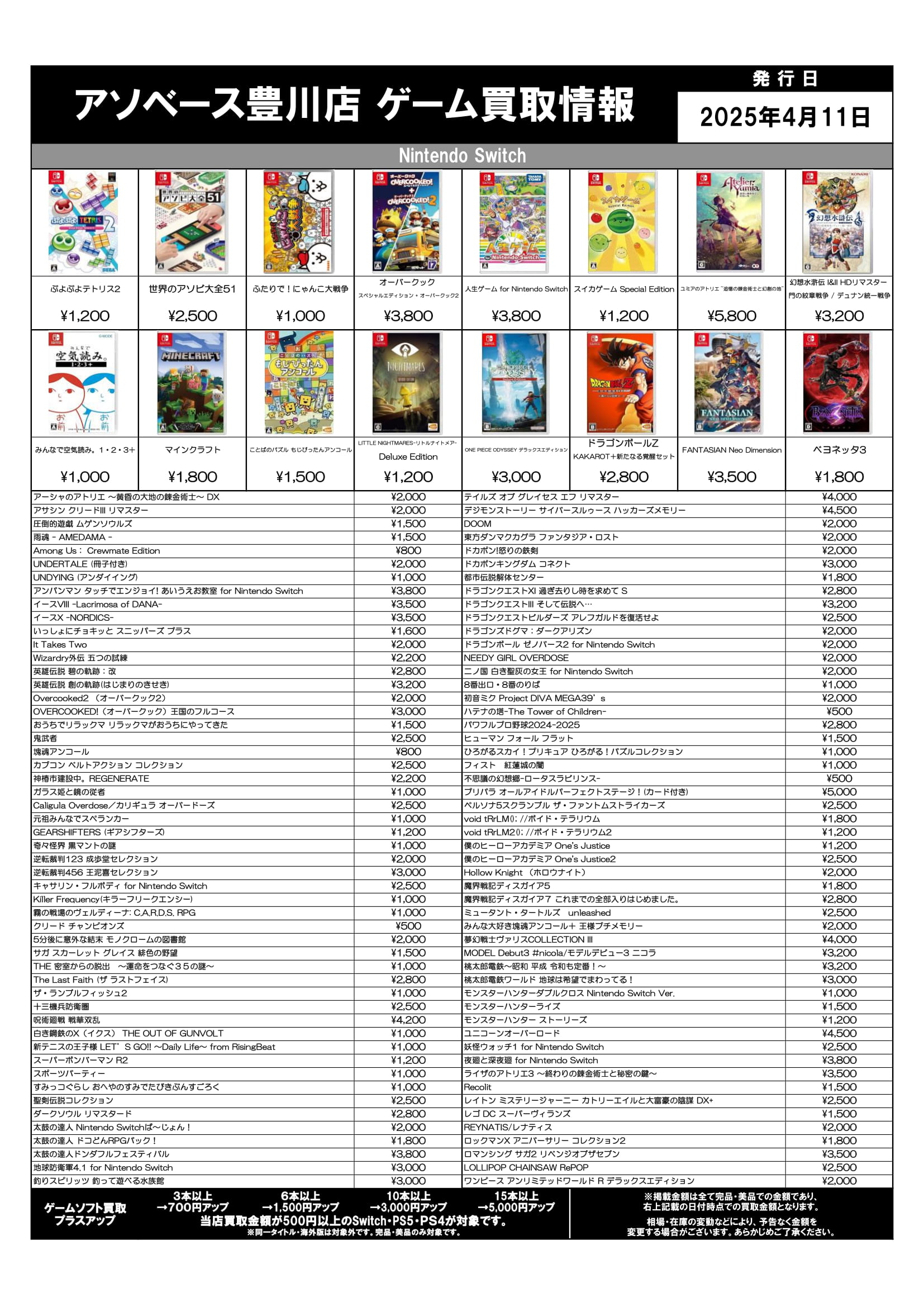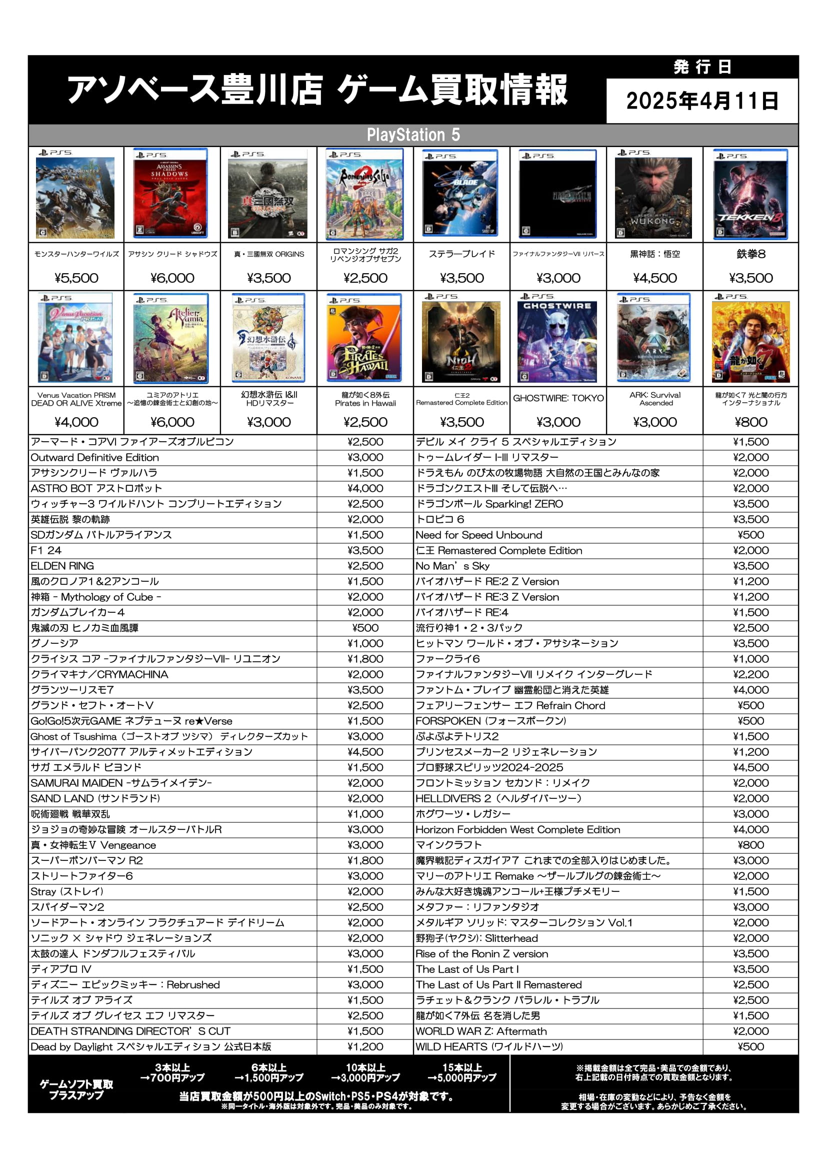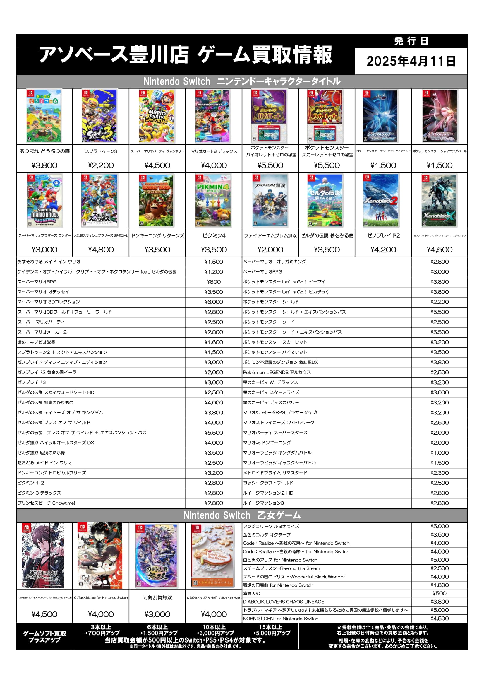 【アソベース豊川店】🎮ゲーム買取情報の更新です!🎮 アソベース豊川店 豊川店 買取情報 豊川店 ゲーム 2025年4月12日 🎮ゲーム買取情報の更新です!🎮 アソベース豊川ではSwitch/PS4/PS5の本体やソフトの買取をしております! ゲームを売るのも買うのもアソベース豊川で!🚀 ※2025/4/12 現在の価格となります。 在庫状況などによってお値段が変動いたします。予めご了承ください。