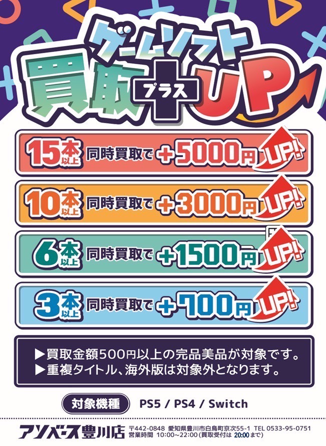 【アソベース豊川店】🎮ゲーム買取価格速報🎮 アソベース豊川店 豊川店 買取情報 豊川店 こんなの買取ました! 豊川店 ゲーム 2025年4月13日 🎮ゲーム買取価格速報🎮 たくさんのソフトの買取をさせて頂きました‼️ ありがとうございます😊 アソベース豊川では、ゲームソフトの買取プラスアップも行っております👏 この機会に足を運んでみては‼️ ゲームを売るならアソベース豊川🚀 ※2025/4/13現在の価格となります。 在庫状況・状態によってお値段が変動いたします。予めご了承ください。 **************** こちら↓もぜひチェックしてみてくださいね♪(*´▽`*) ・最新のイベント情報はこちら ・最新の買取情報はこちら