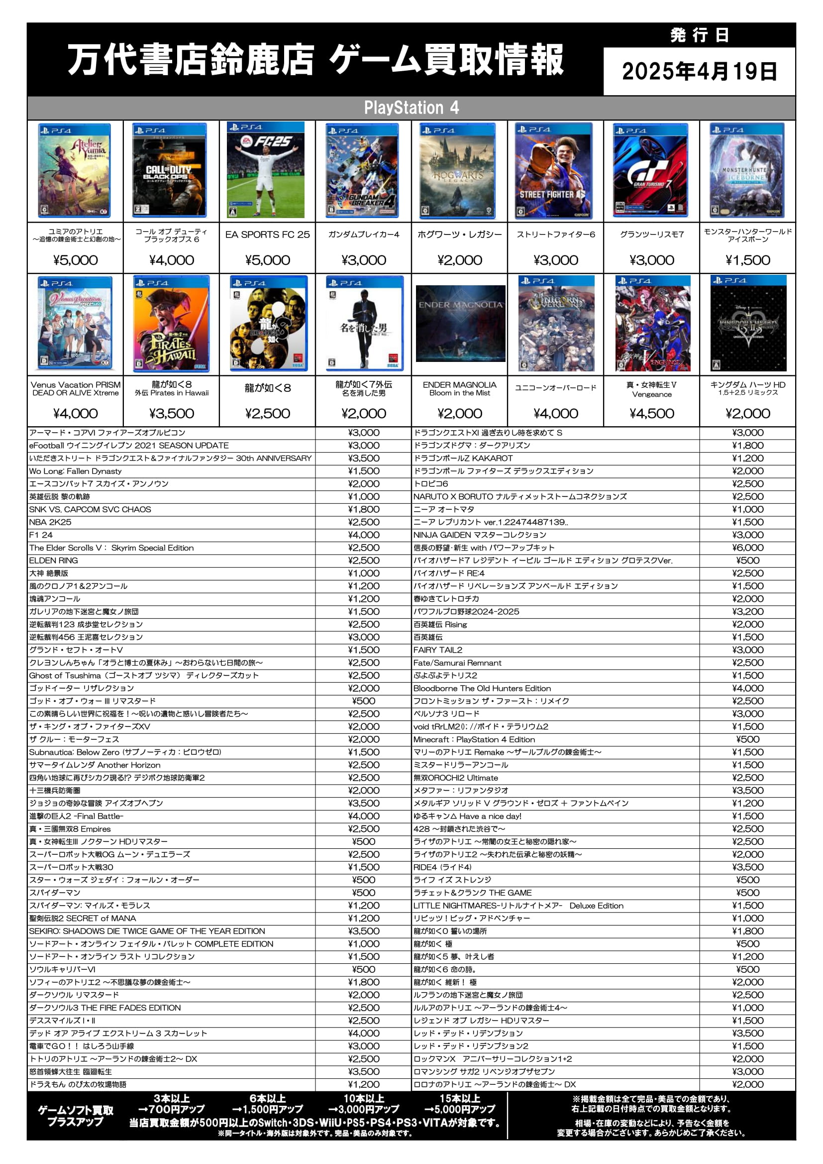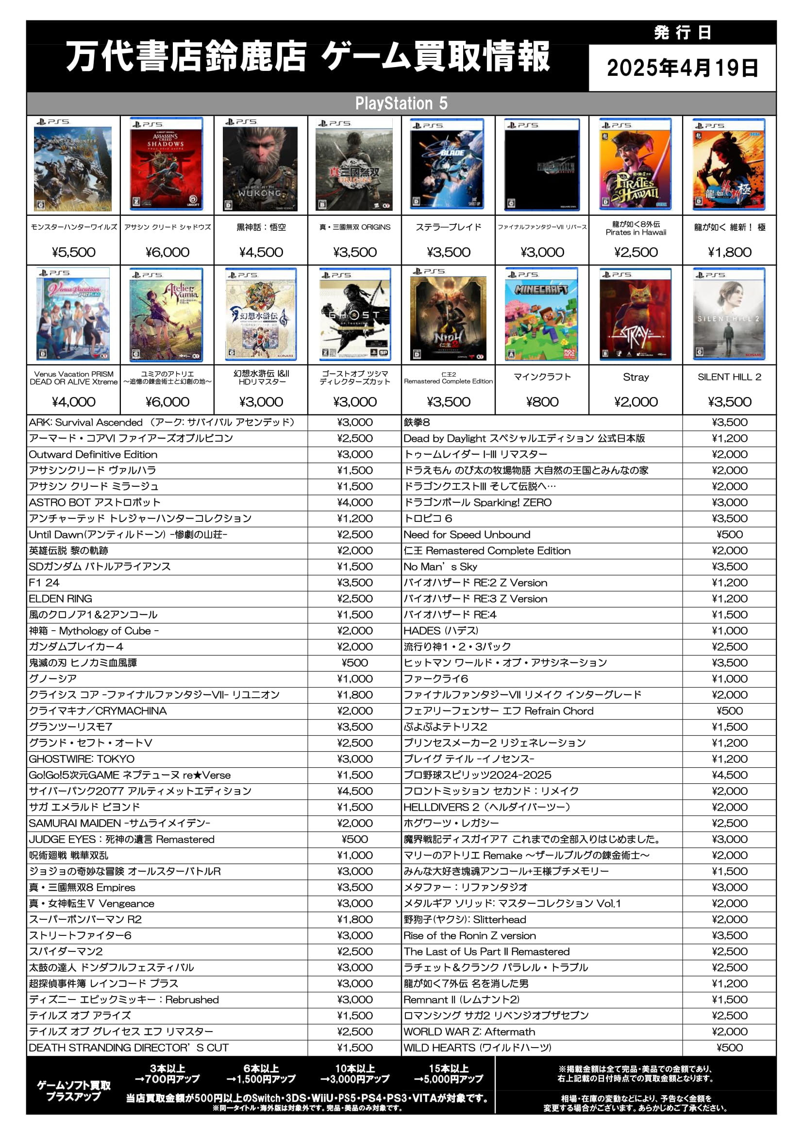 【鈴鹿店】★ゲーム買取情報0419★ new 万代書店鈴鹿店 鈴鹿店 買取情報 鈴鹿店 ゲーム 2025年4月19日 ゲーム買取情報を更新しました! 遊び終わったゲーム売ってください!! ※2025/4/19現在の価格となります。 在庫状況・状態によってお値段が変動いたします。予めご了承ください。 **************** こちら↓もぜひチェックしてみてくださいね♪(*´▽`*) ・最新のイベント情報はこちら ・最新の買取情報はこちら
