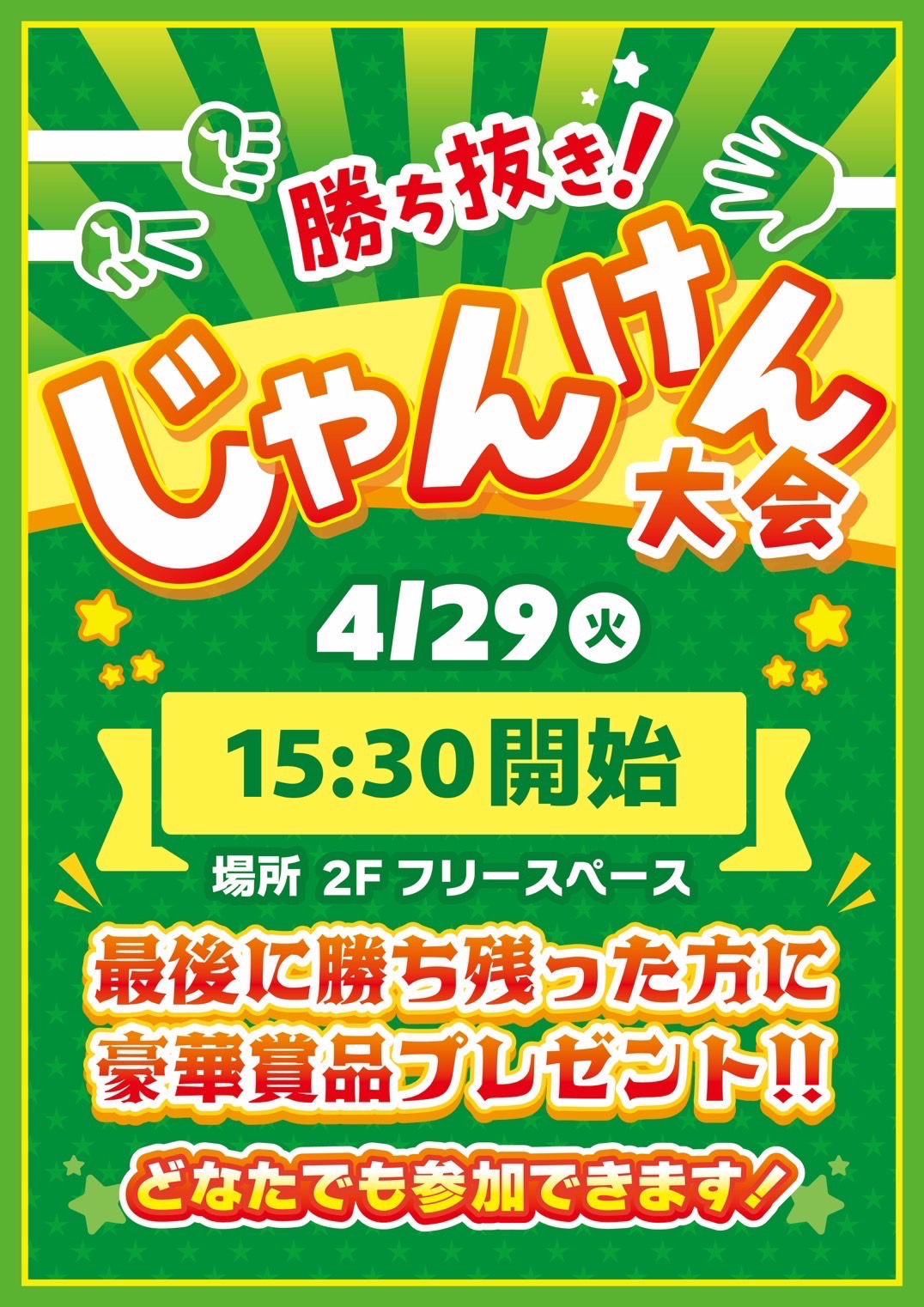 【鈴鹿店】★4/29 勝ち抜き!じゃんけん大会開催!★ new 万代書店鈴鹿店 鈴鹿店 イベント情報 2025年4月25日 店舗イベント 4/29 勝ち抜き!じゃんけん大会開催! **************** こちら↓もぜひチェックしてみてくださいね♪(*´▽`*) ・最新のイベント情報はこちら ・最新の買取情報はこちら