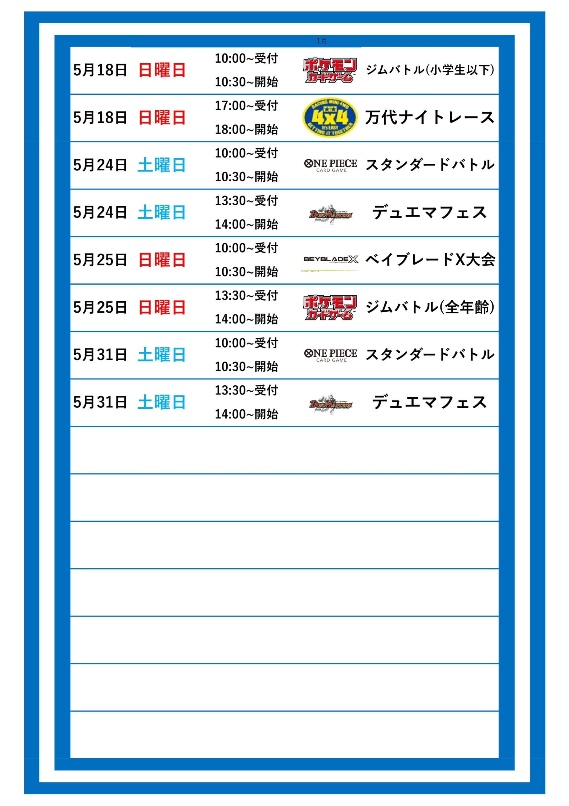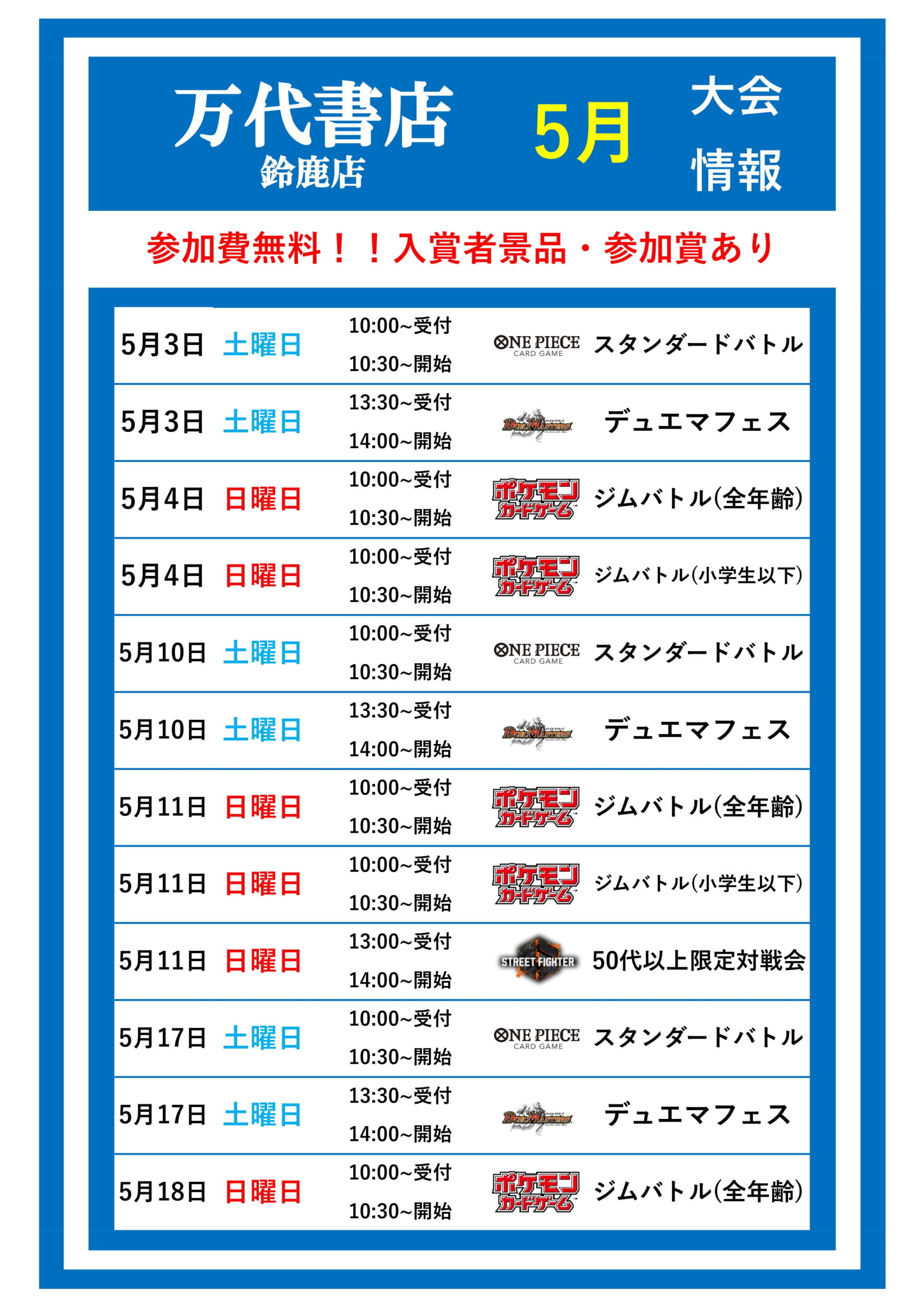 【鈴鹿店】★5月の大会カレンダー★ new 万代書店鈴鹿店 鈴鹿店 イベント情報 鈴鹿店 おもちゃ 鈴鹿店 カード 鈴鹿店 ゲーム 2025年4月28日 ★5月の大会カレンダー★ **************** こちら↓もぜひチェックしてみてくださいね♪(*´▽`*) ・最新のイベント情報はこちら ・最新の買取情報はこちら