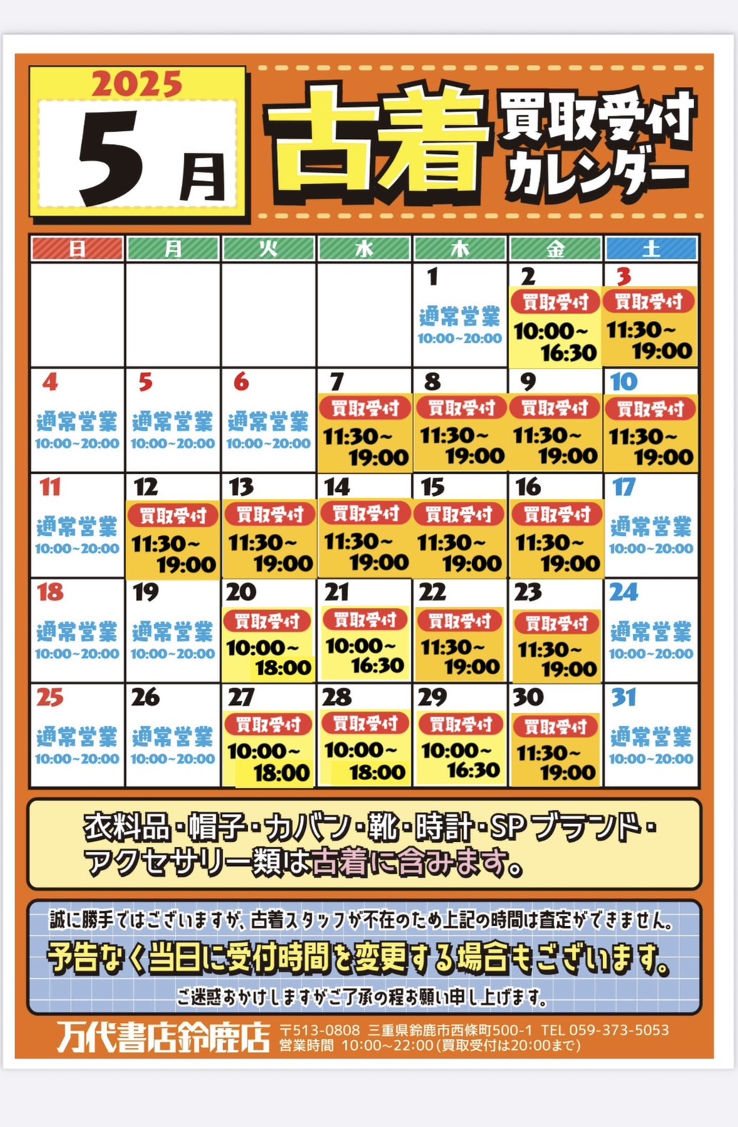 【鈴鹿店】5月度の古着買取カレンダーになります👕👚👟