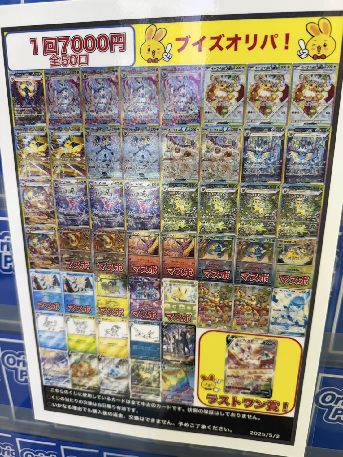 【鈴鹿店】カードコーナーより! ポケカブイズオリパ発売中! 未分類 2025年5月2日 カードコーナーより! ポケカブイズオリパ発売中! 1回7000円 全50口! 当たりはブラッキーSAR✨ 全部ブイズです!